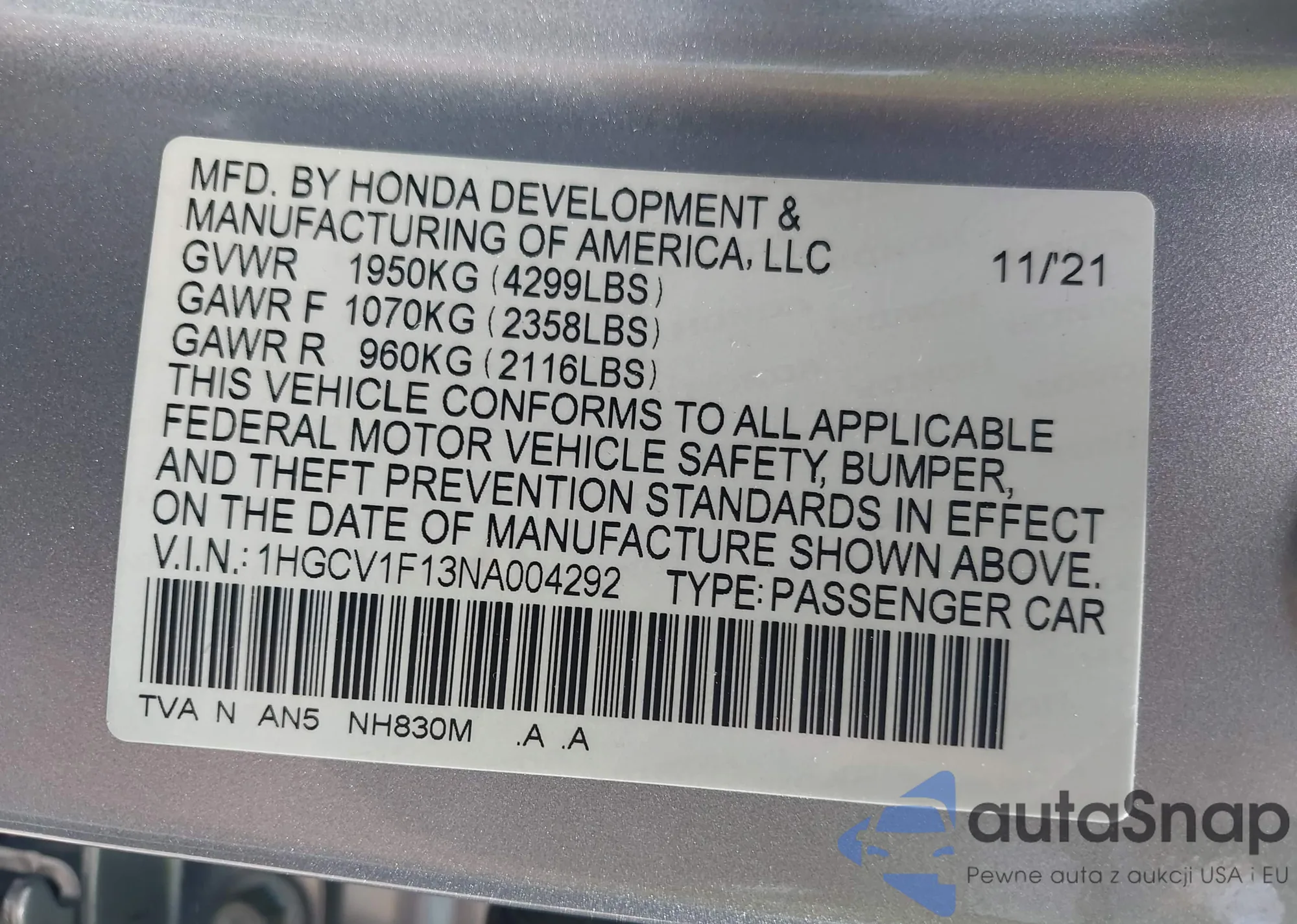 LOT: 42539466 VIN: 1HGCV1F13NA004292