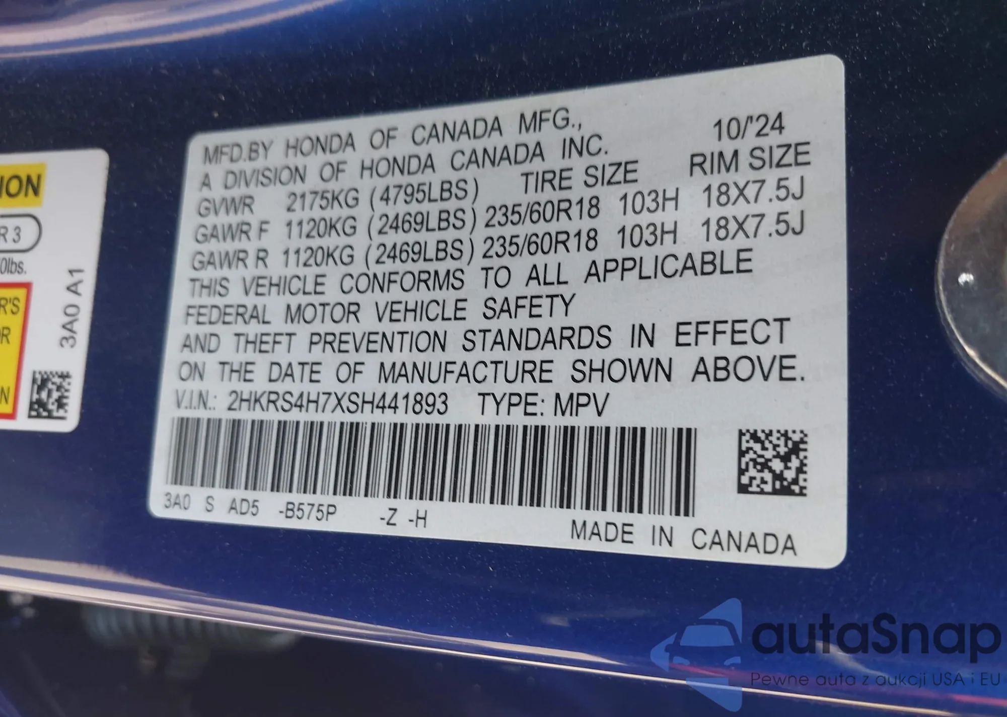 • VIN 2HKRS4H7XSH441893