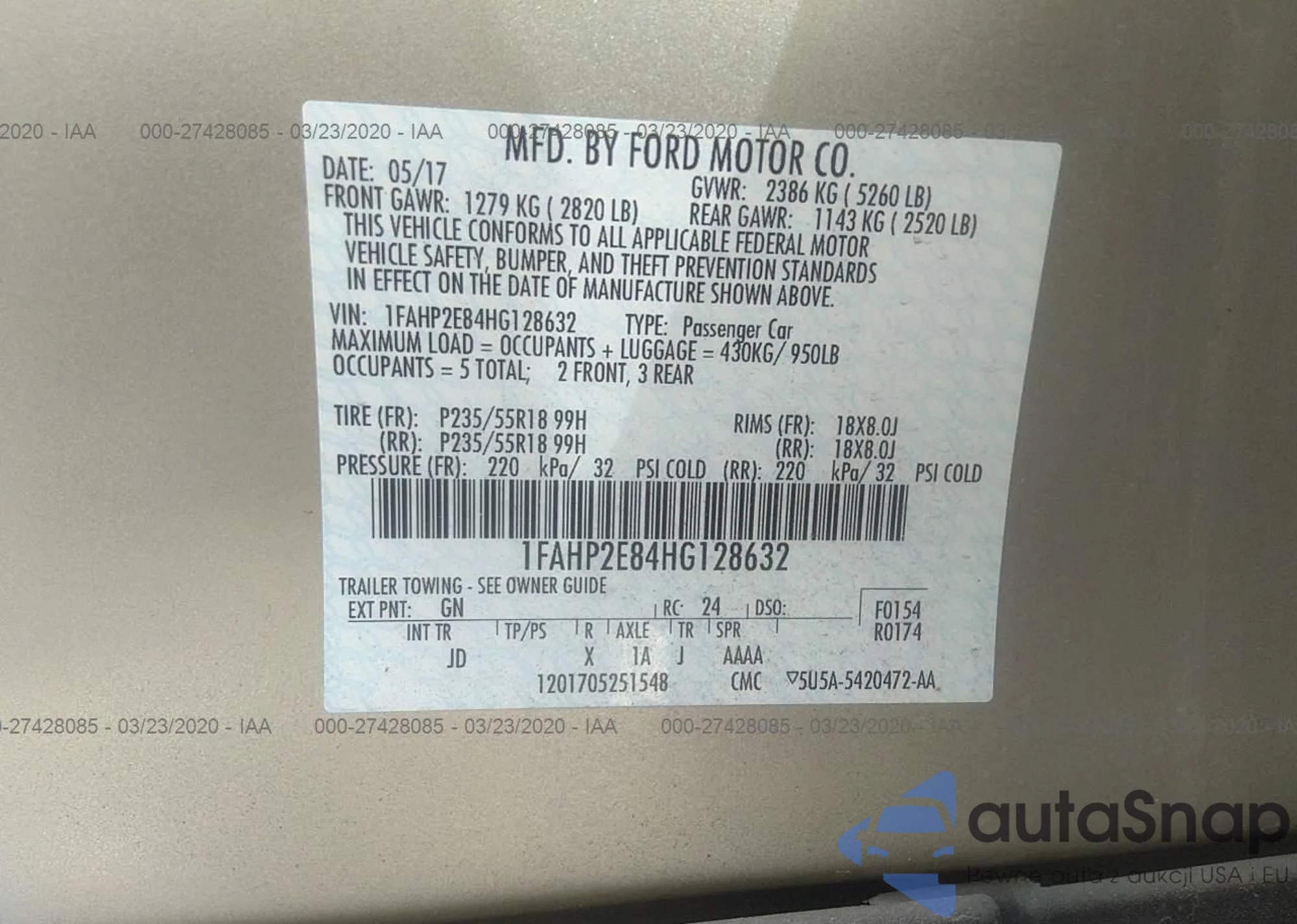 LOT: 27428085 VIN: 1FAHP2E84HG128632