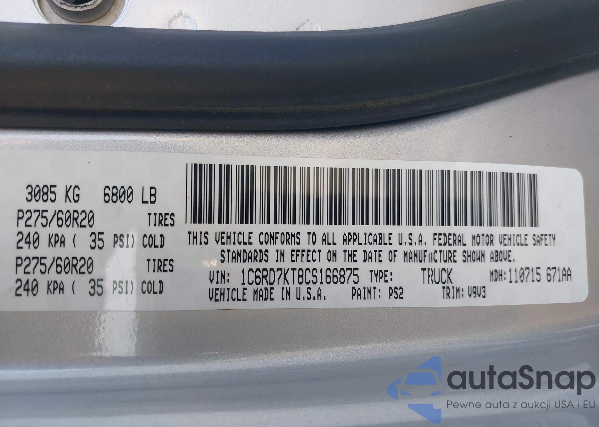 • VIN 1C6RD7KT8CS166875