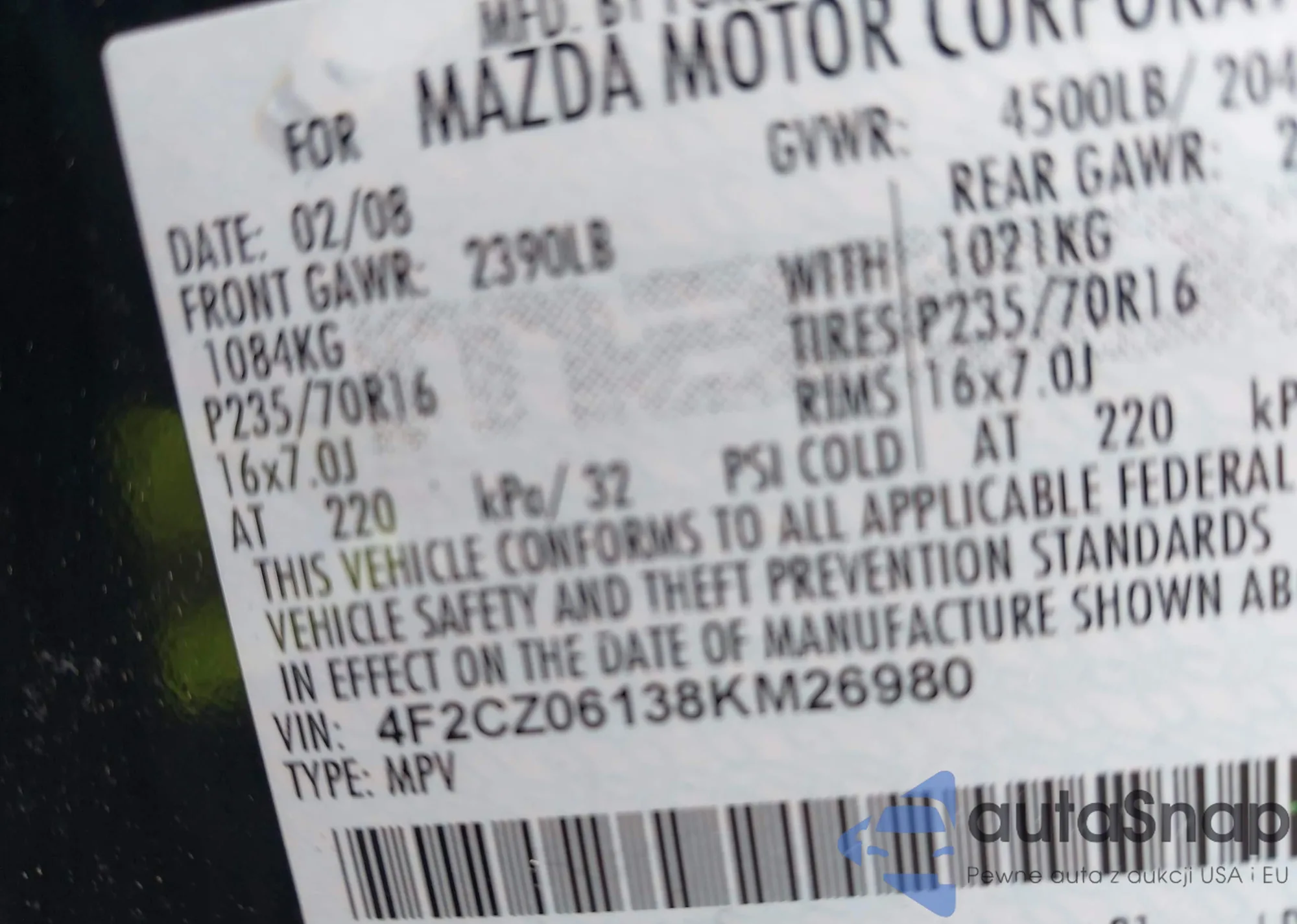 LOT: 42661091 VIN: 4F2CZ06138KM26980