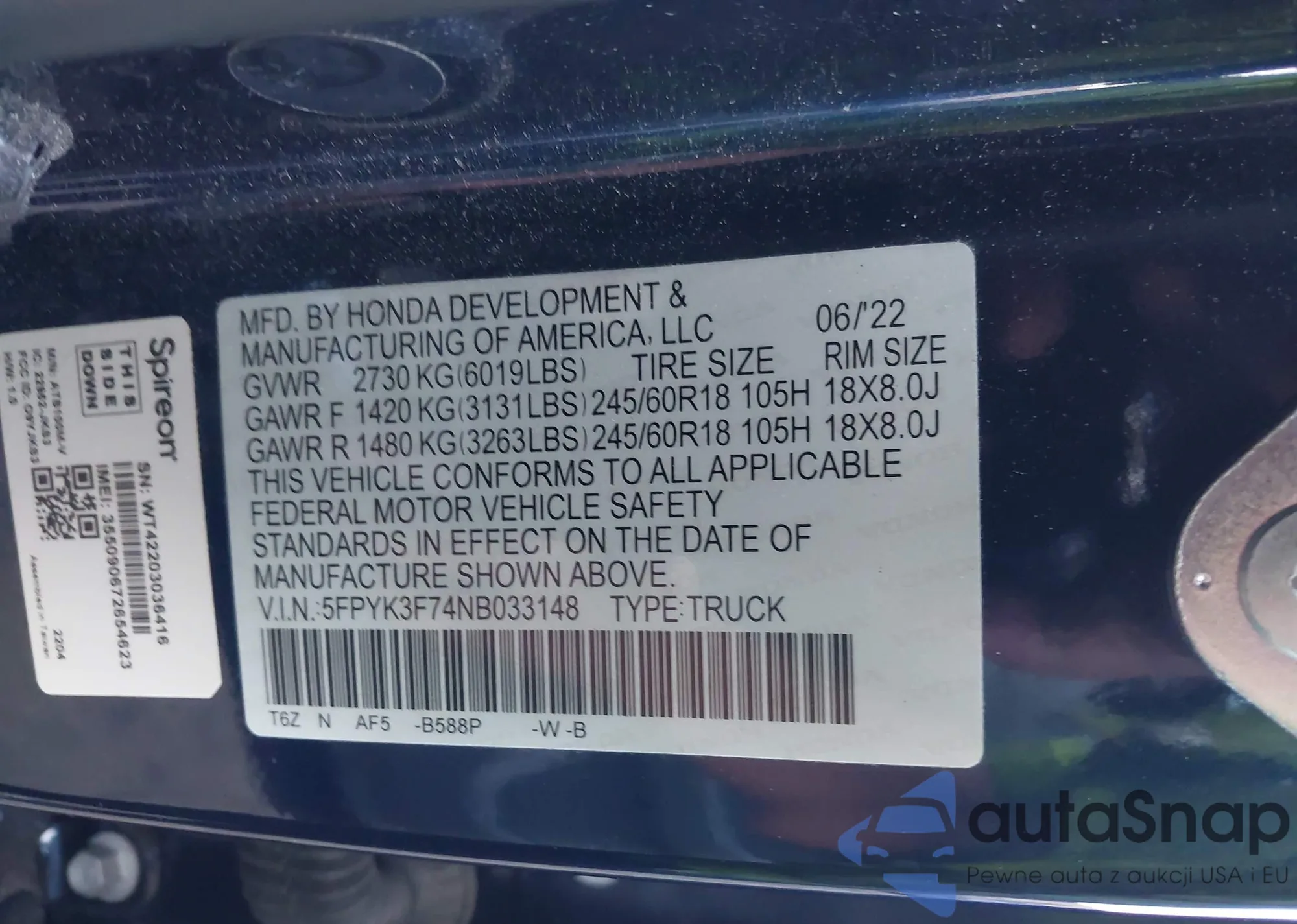 • VIN 5FPYK3F74NB033148