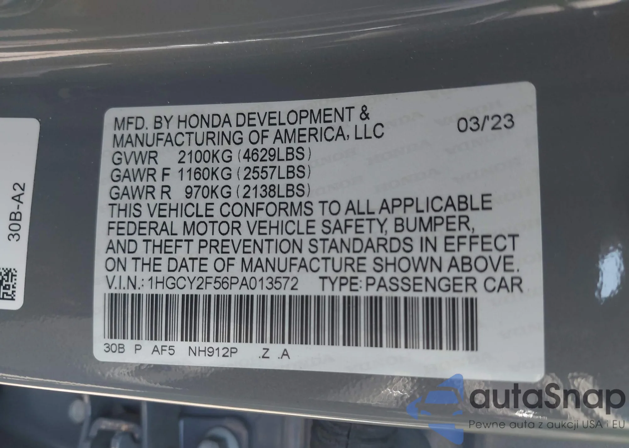 LOT: 43016439 VIN: 1HGCY2F56PA013572
