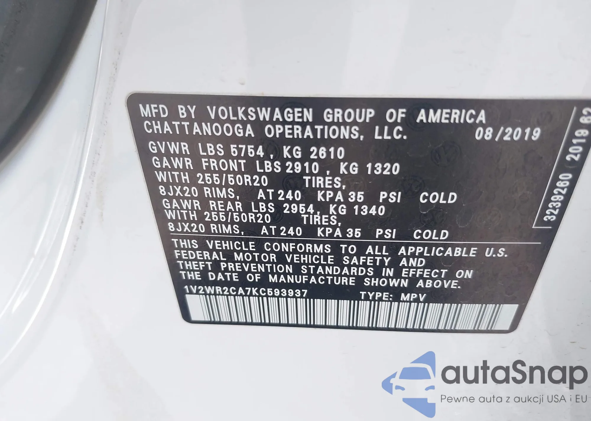 LOT: 43039114 VIN: 1V2WR2CA7KC593937