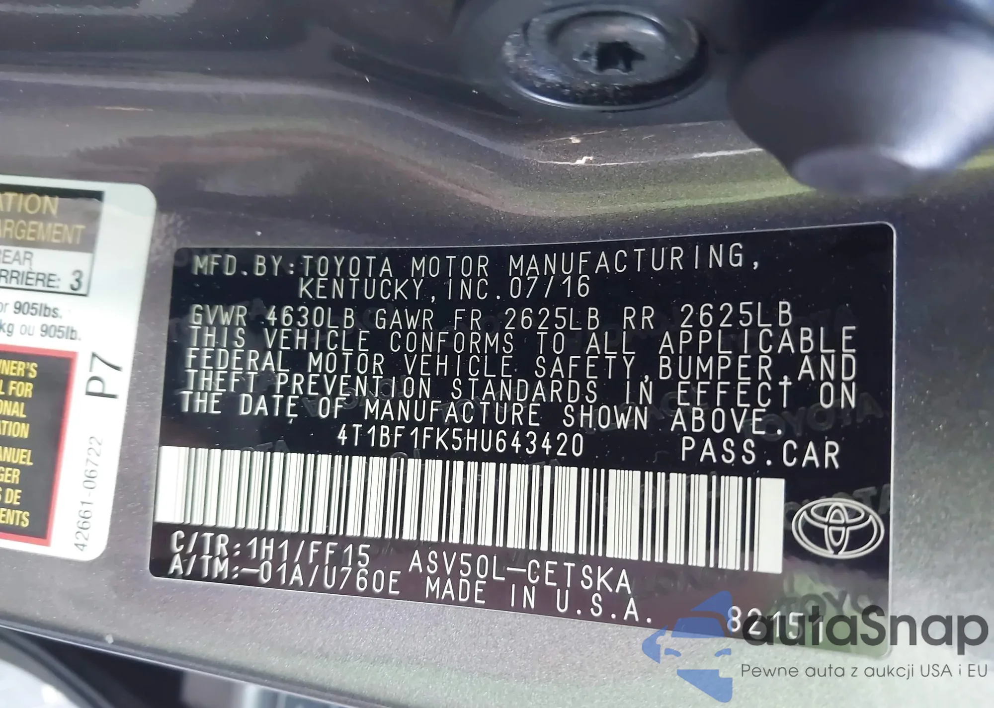 LOT: 43149101 VIN: 4T1BF1FK5HU643420