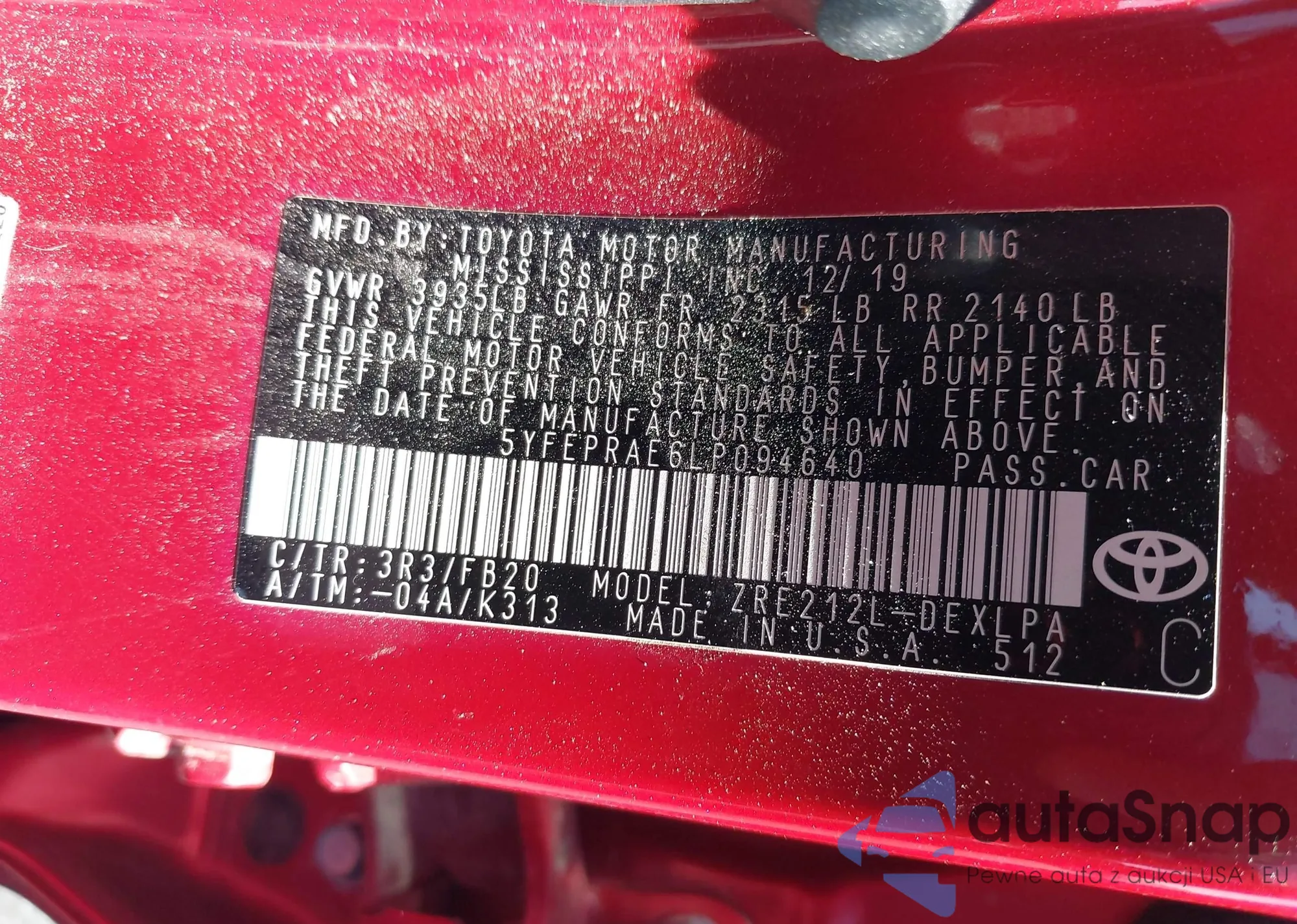 LOT: 43107443 VIN: JTDKN3DU0C5395135
