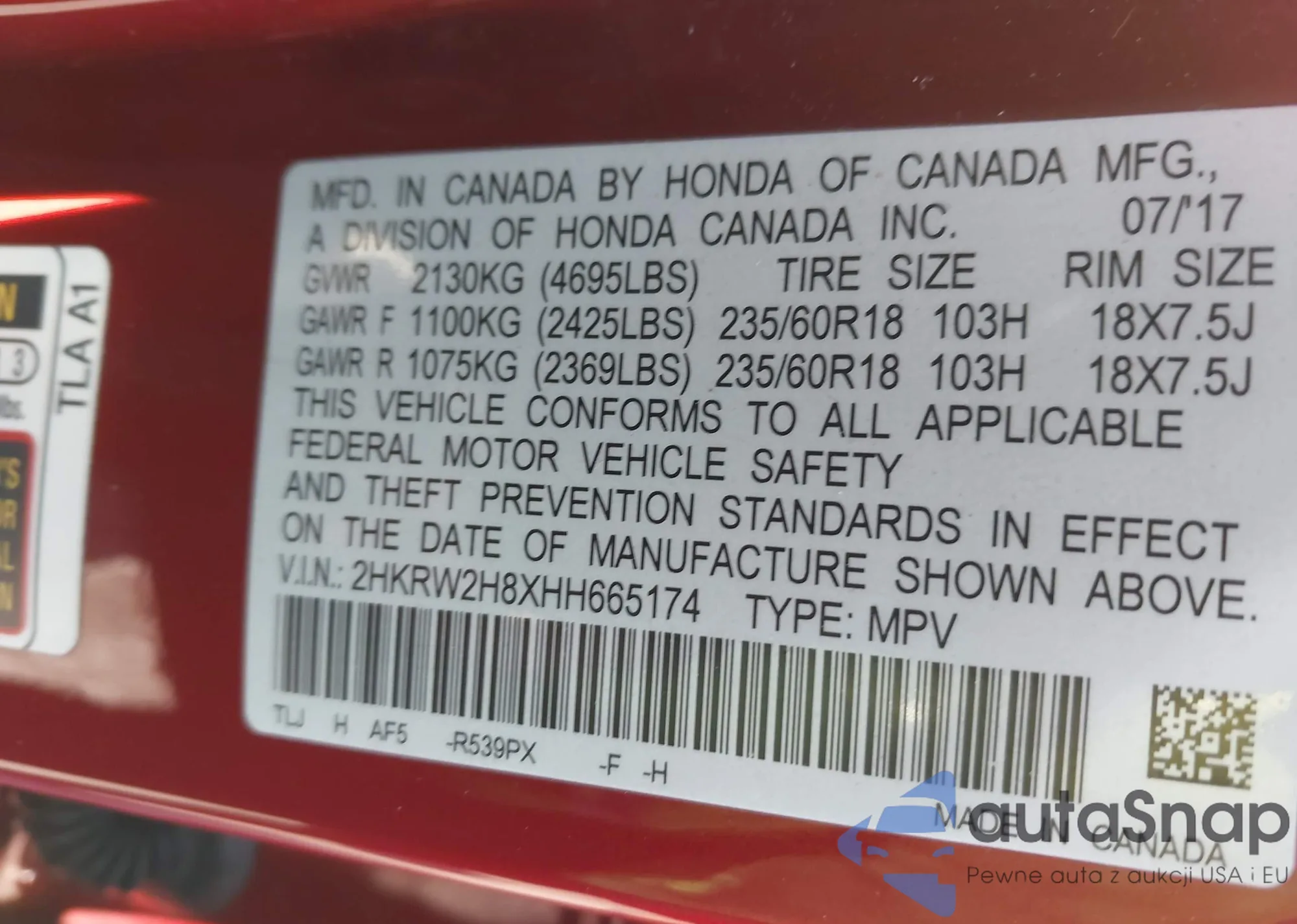 • VIN 2HGFC1F75HH635848