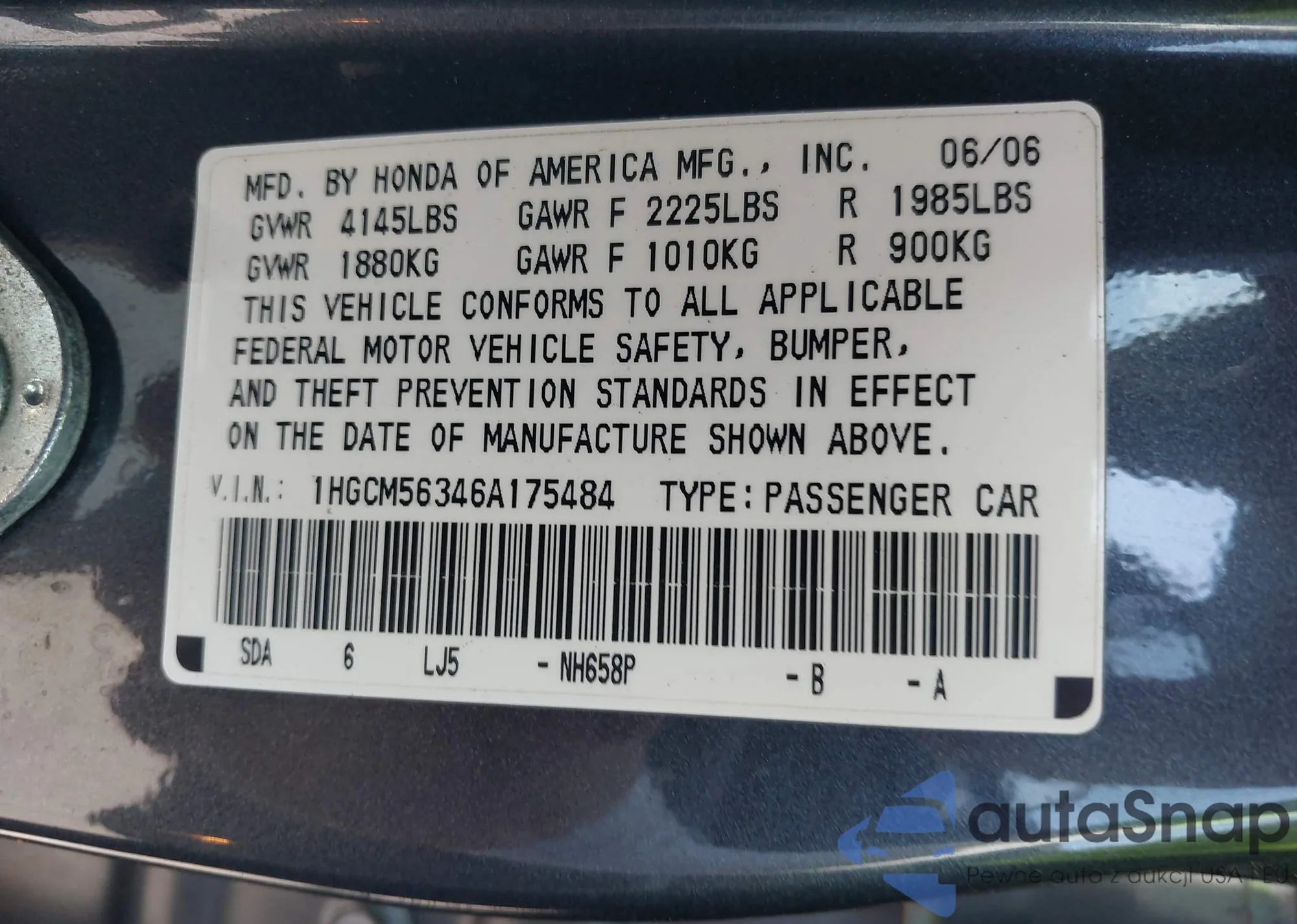 LOT: 43188880 VIN: 1HGCM56346A175484