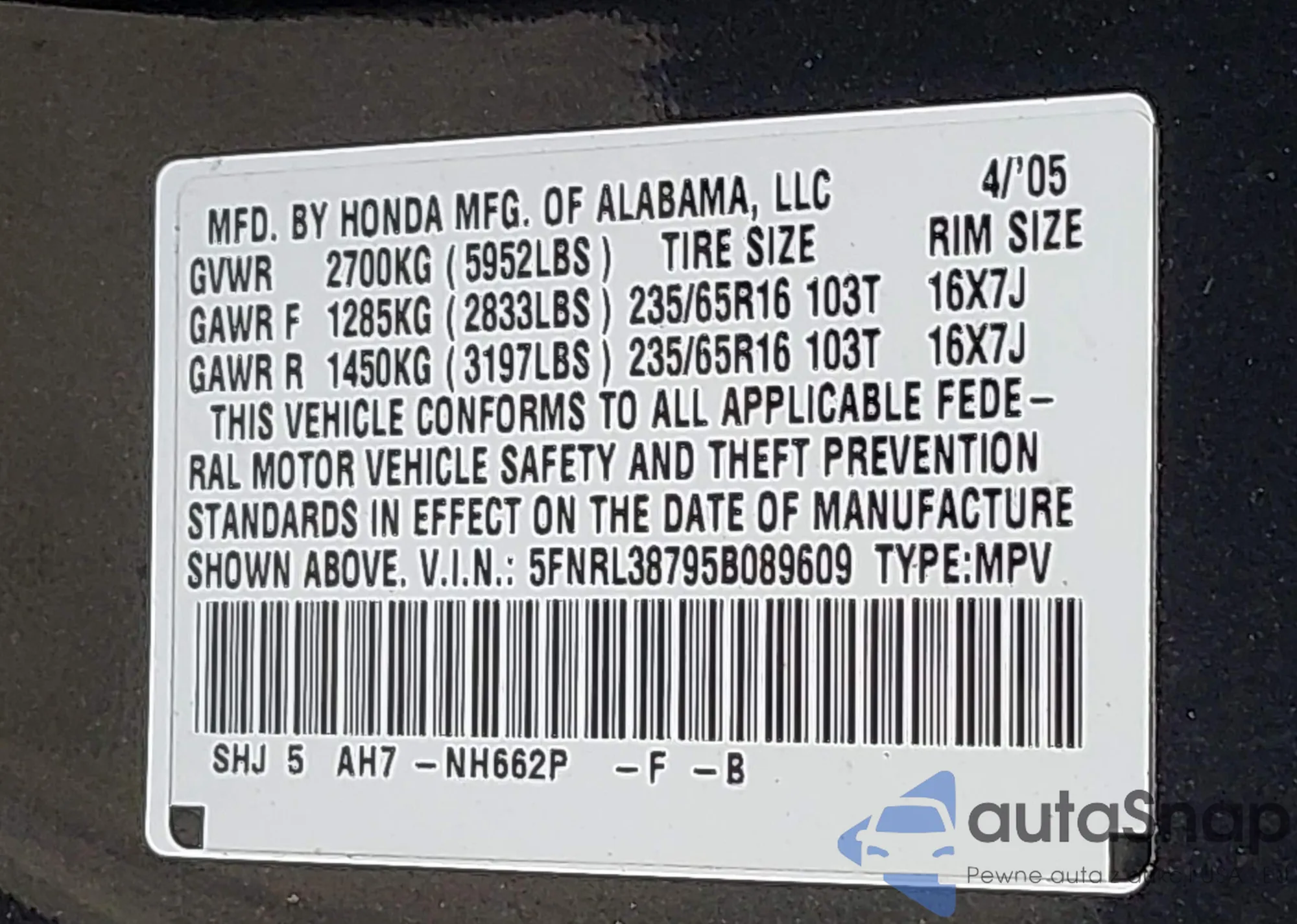 • VIN 5FNRL38795B089609
