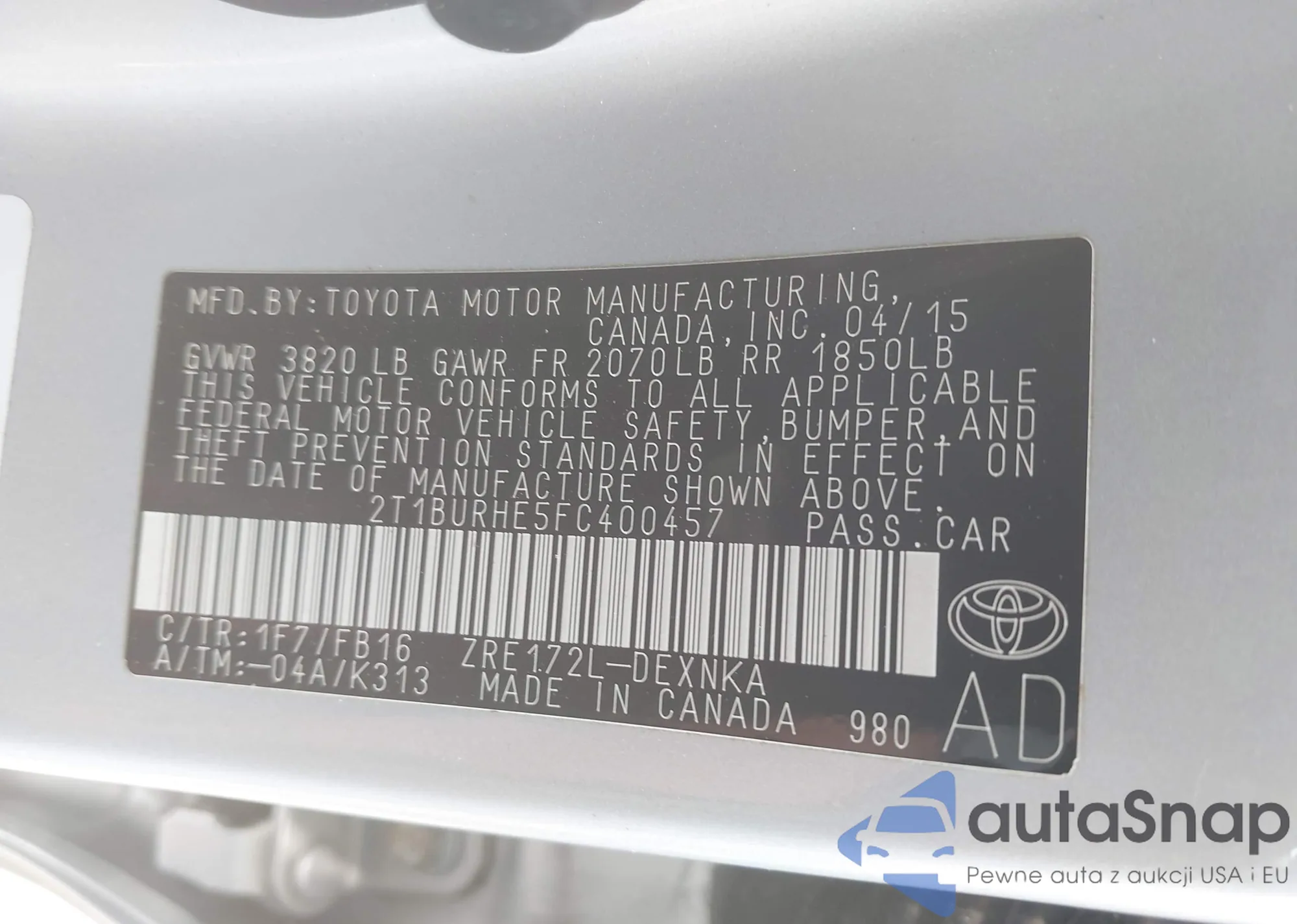 • VIN 2T1BURHE5FC400457