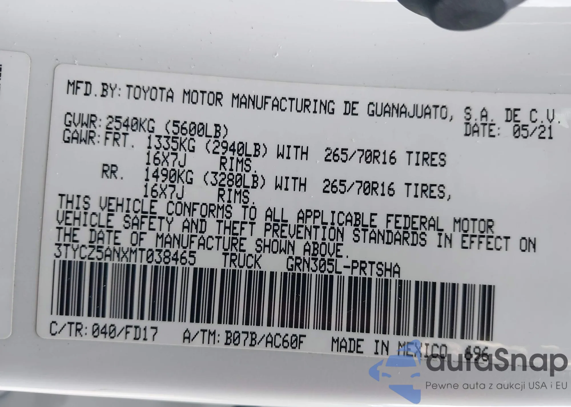 • VIN 3TYCZ5ANXMT038465