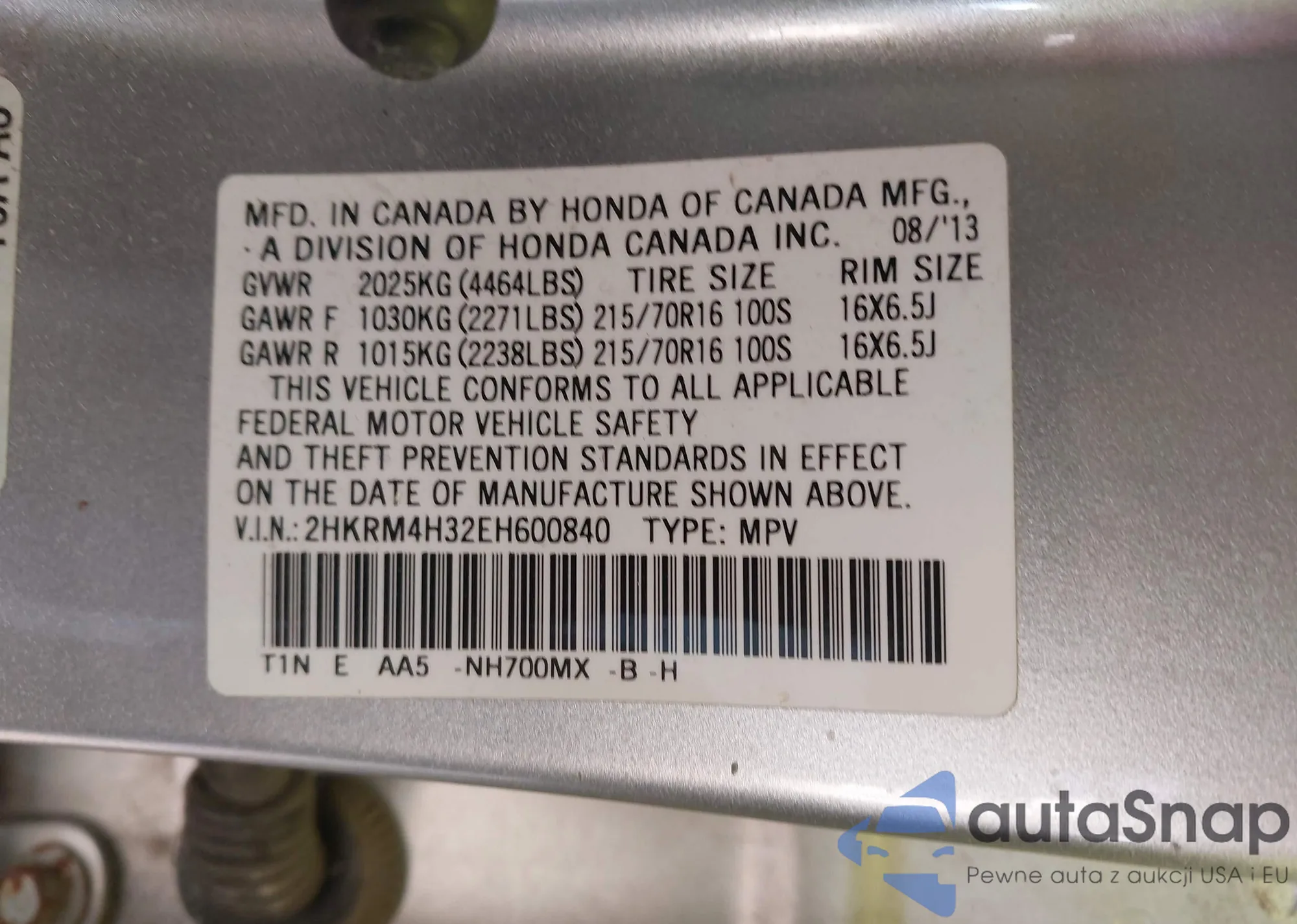 • VIN 2HKRM4H32EH600840