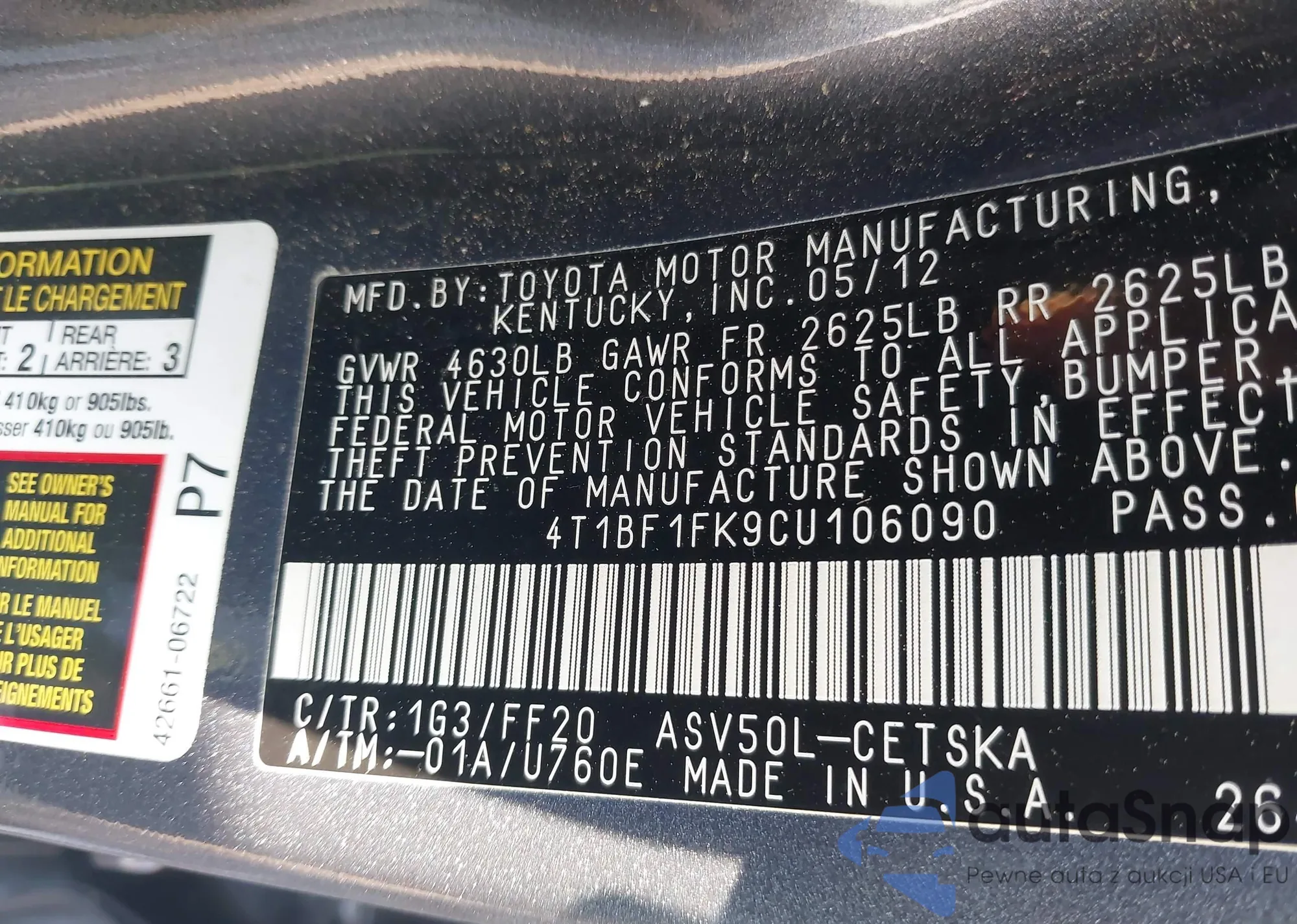 • VIN 4T1BF1FK9CU106090