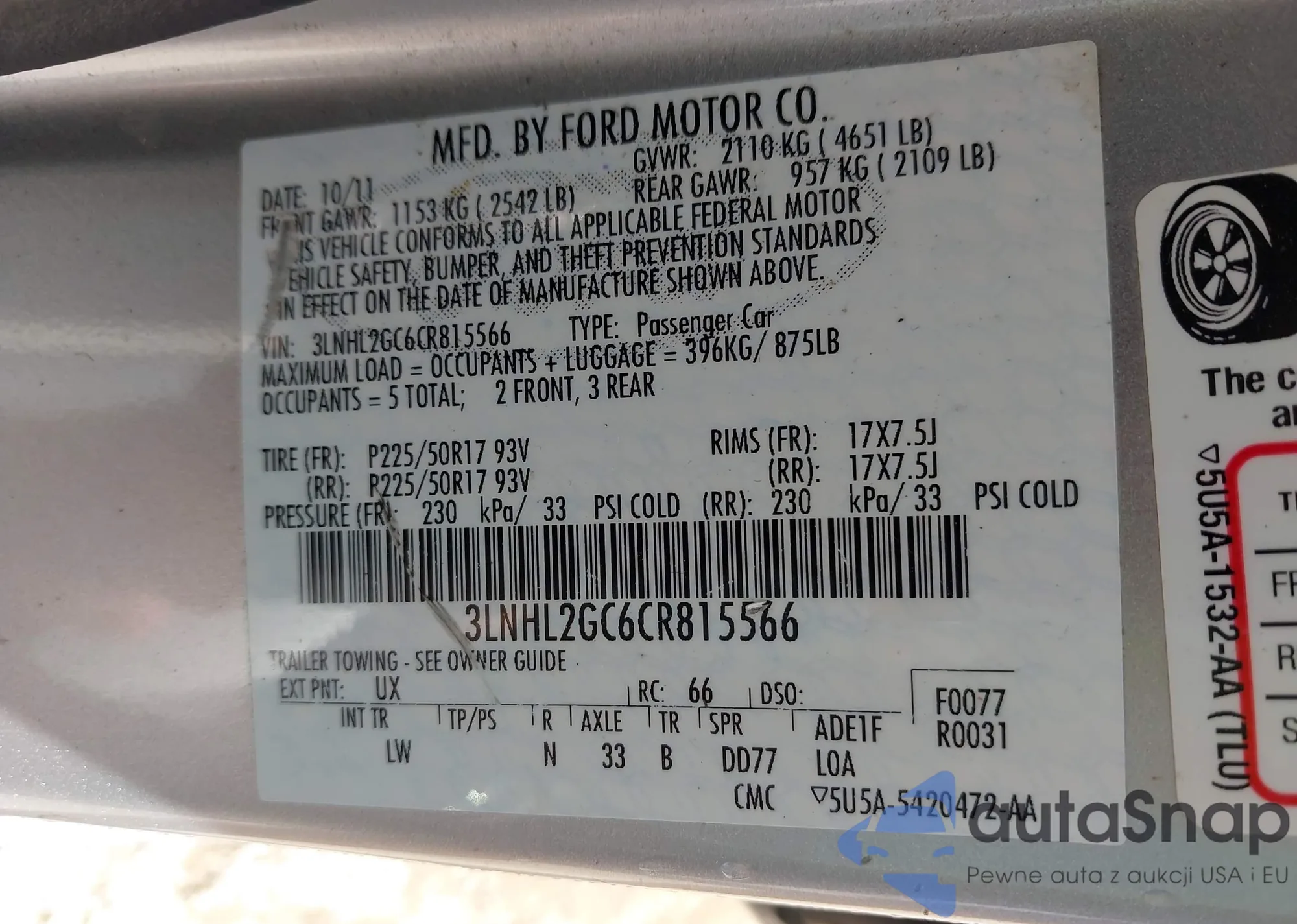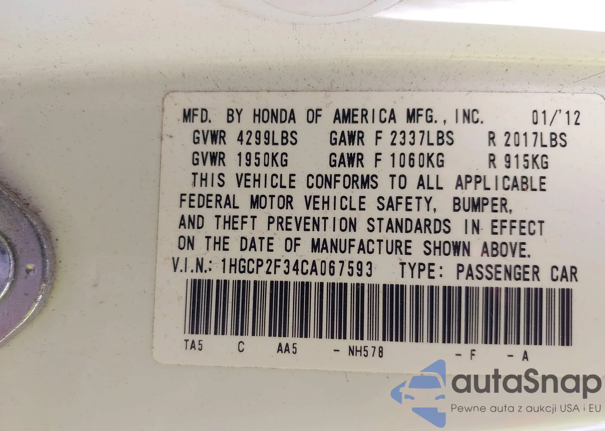 LOT: 42939074 VIN: 1HGCP2F34CA067593
