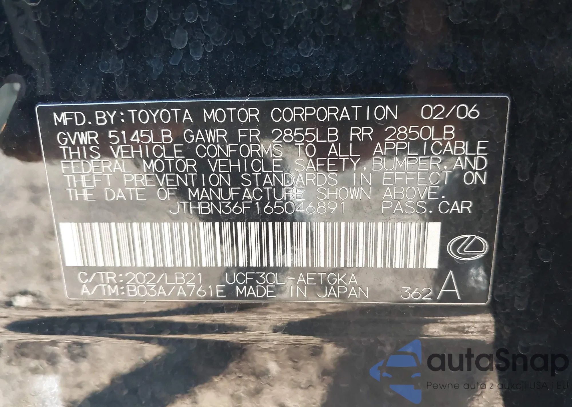 LOT: 43072856 VIN: JTHBN36F165046891