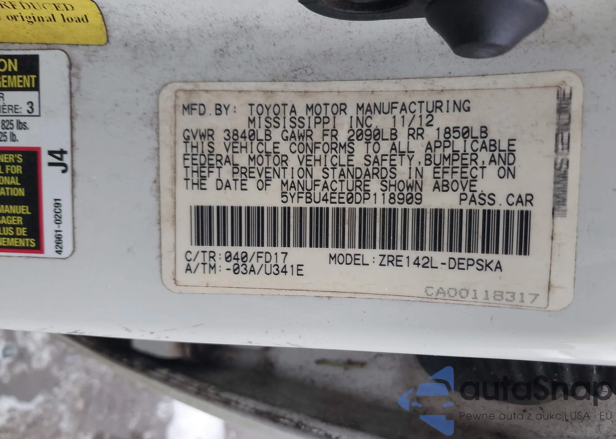 LOT: 43102998 VIN: 5YFBU4EE0DP118909