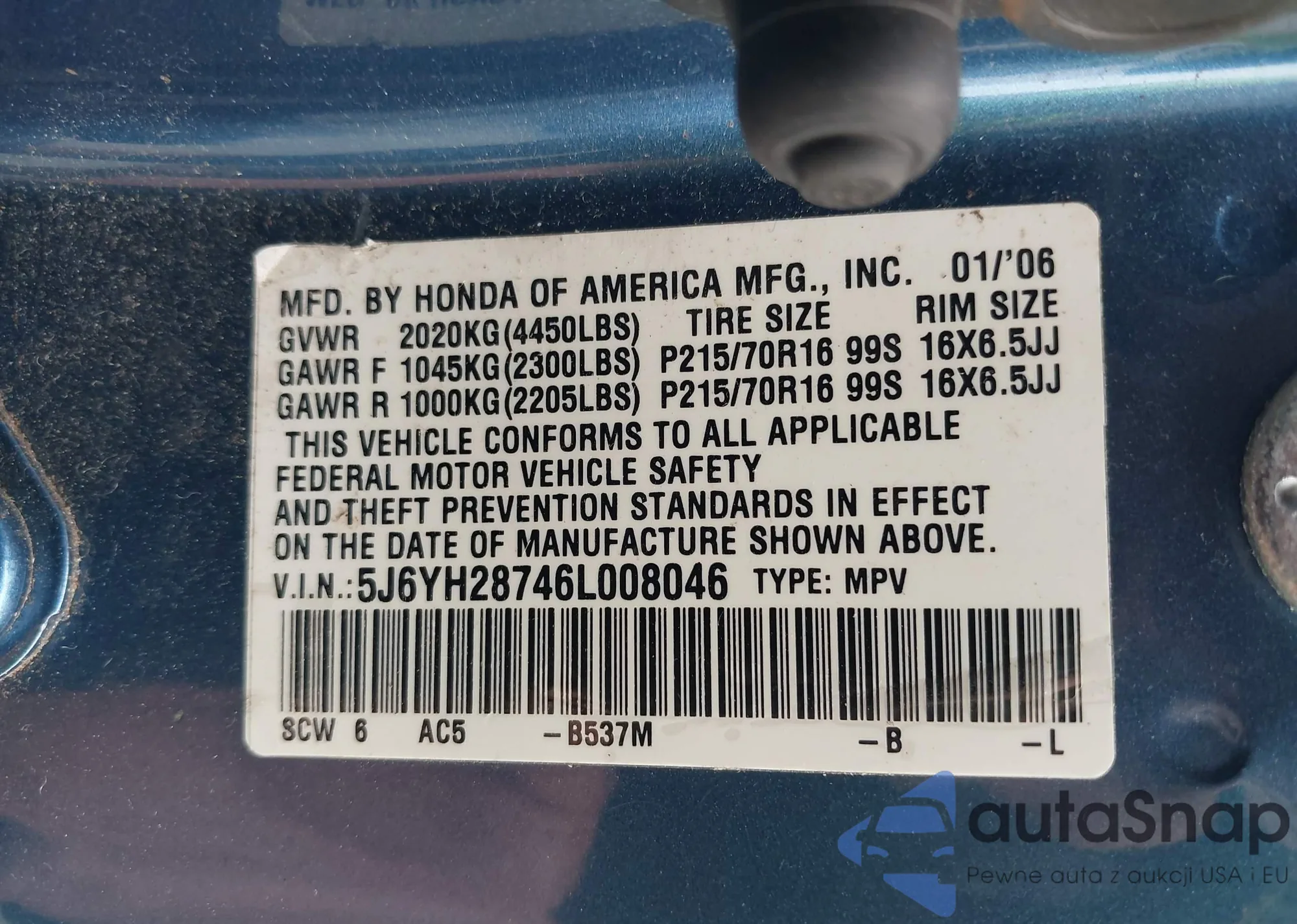 • VIN 5J6YH28746L008046