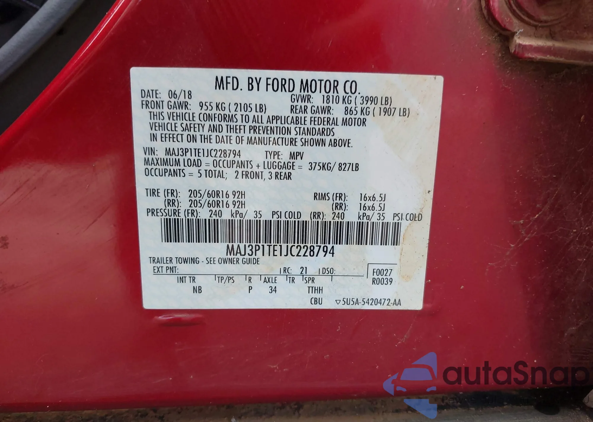 LOT: 42978069 VIN: MAJ3P1TE1JC228794