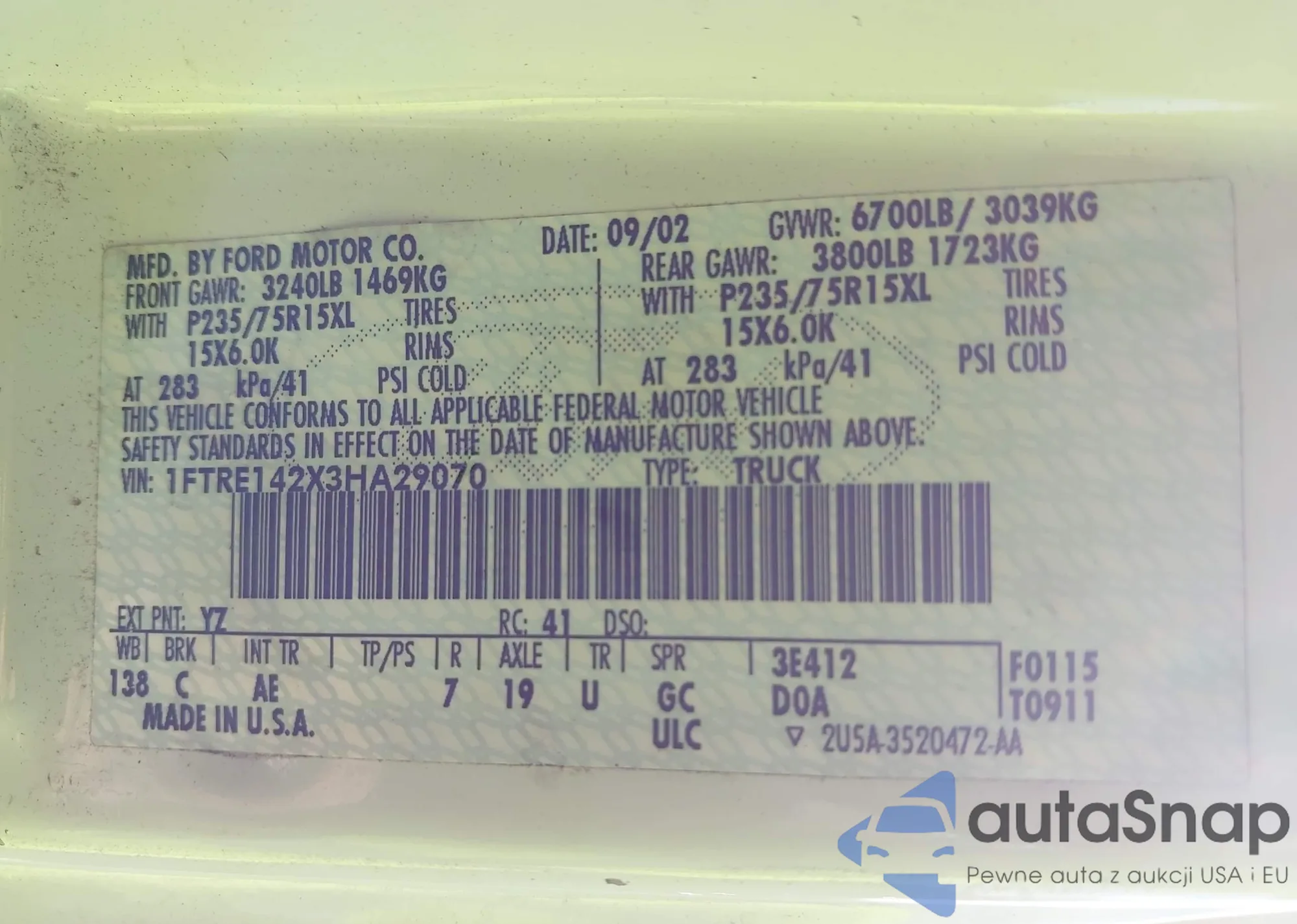 LOT: 43133096 VIN: 1FTRE142X3HA29070