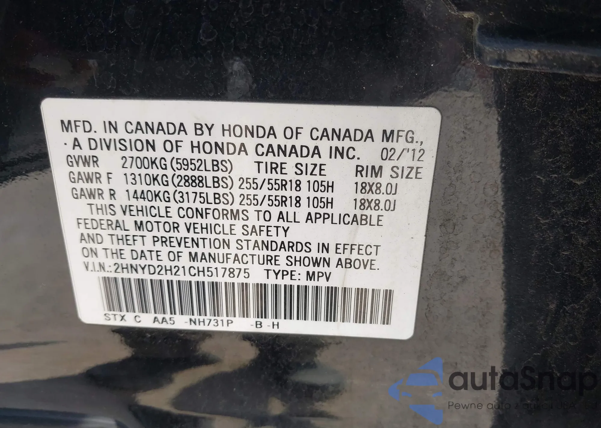 • VIN 2HNYD2H21CH517875