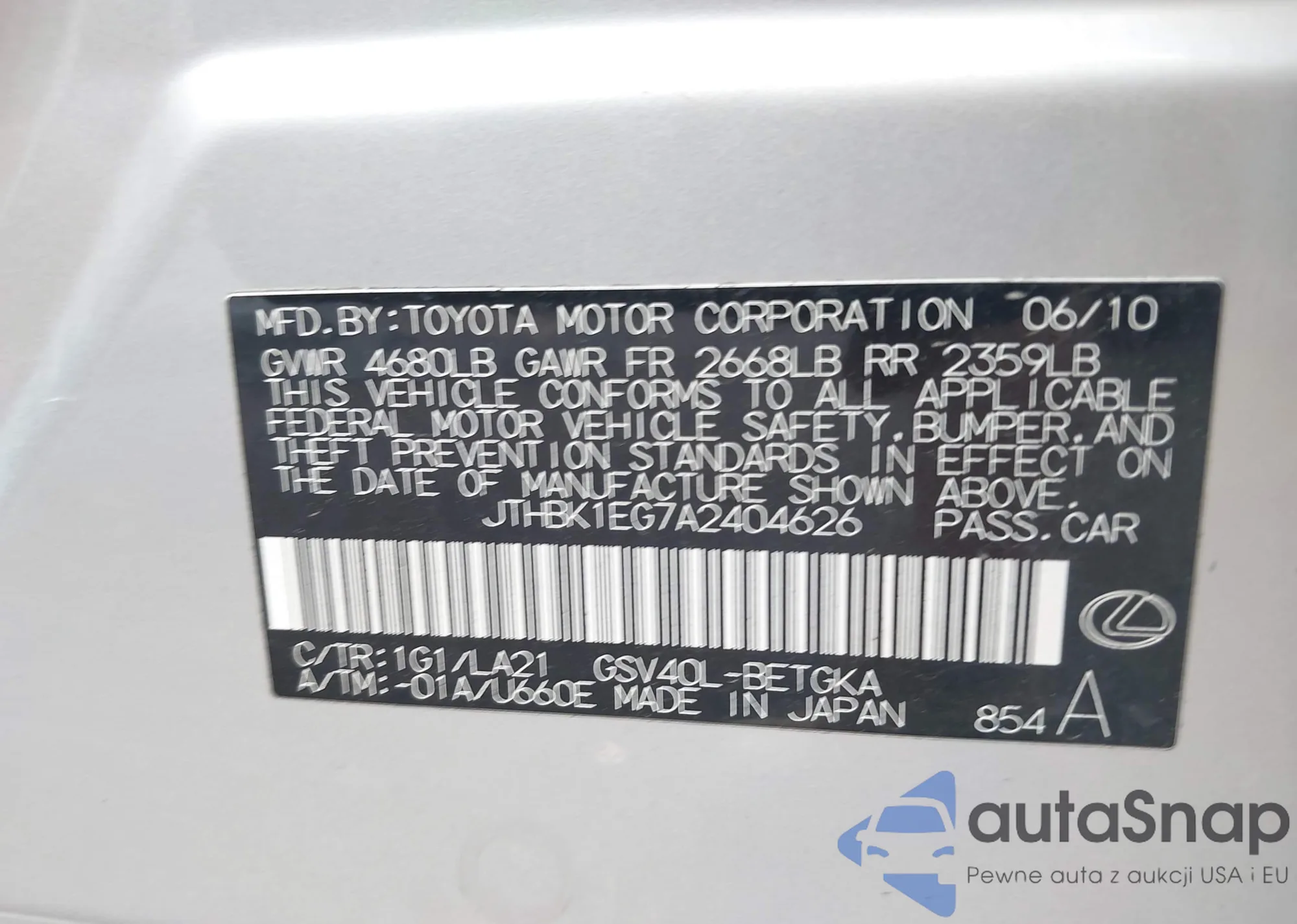 LOT: 42913457 VIN: JTHBK1EG7A2404626