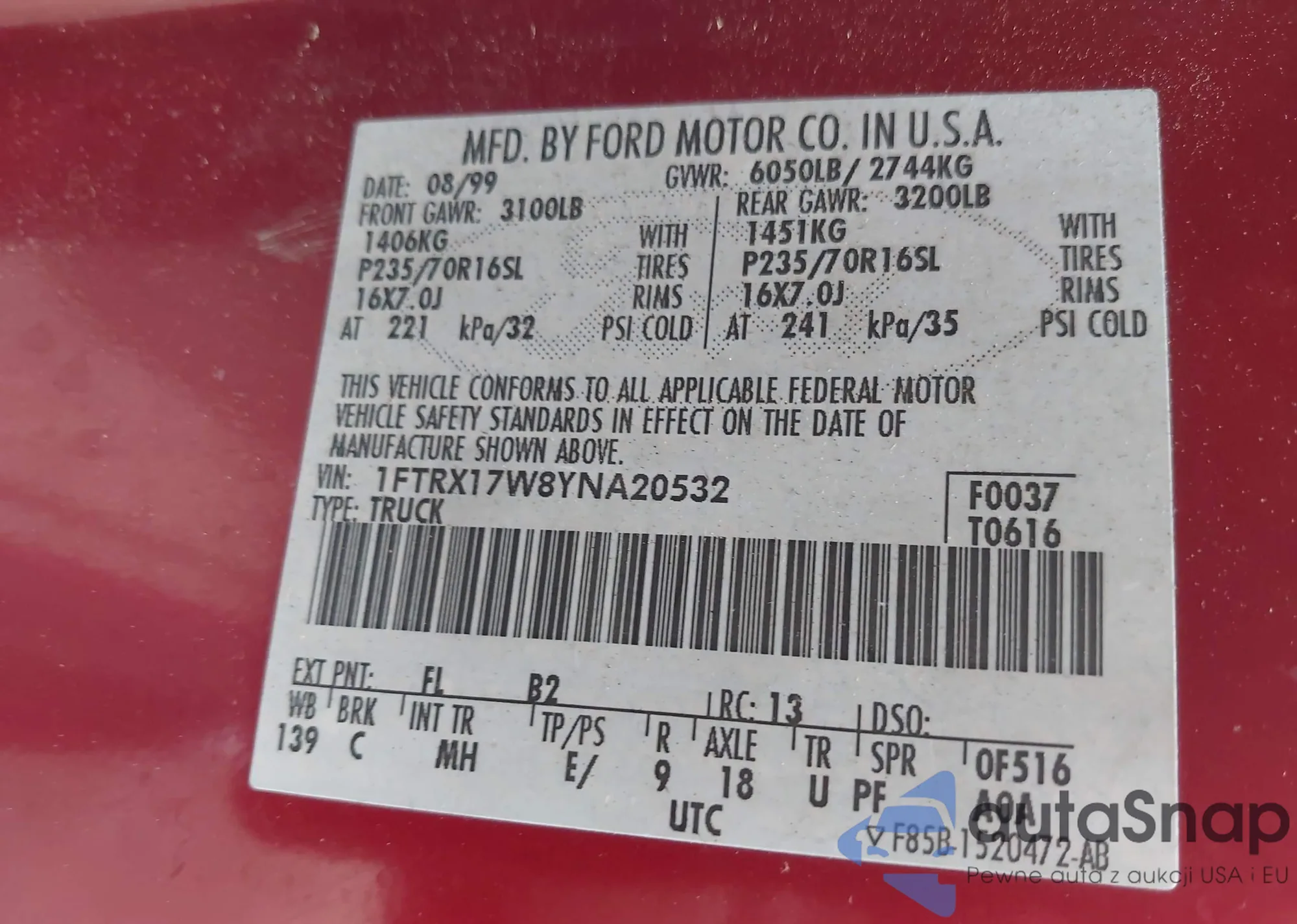• VIN 1FTRX17W8YNA20532