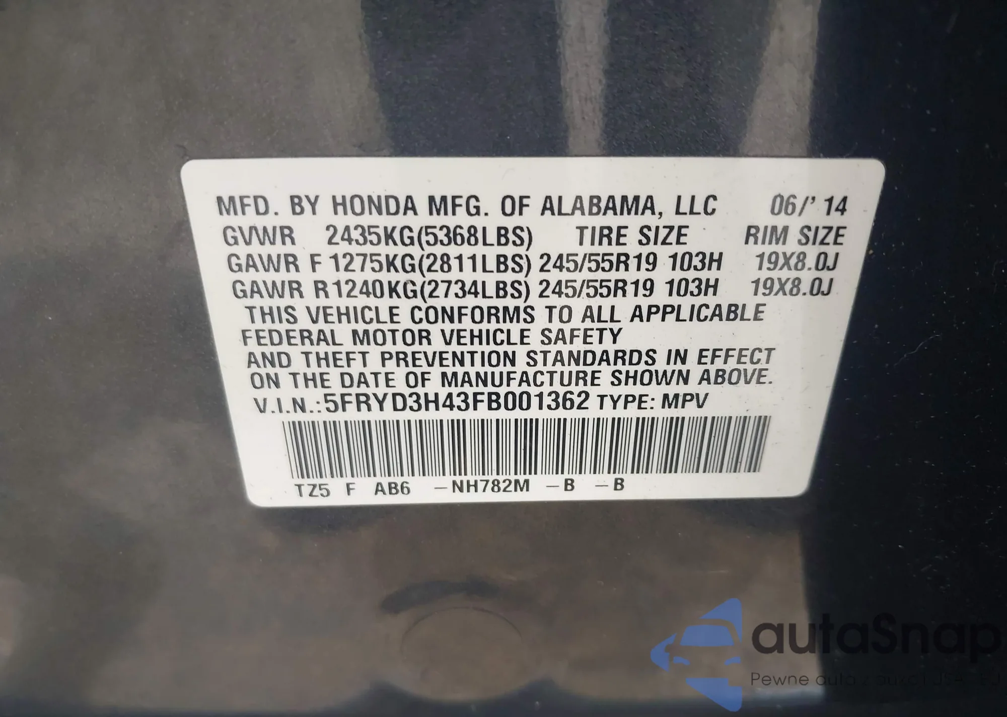 LOT: 42821807 VIN: 5FRYD3H43FB001362
