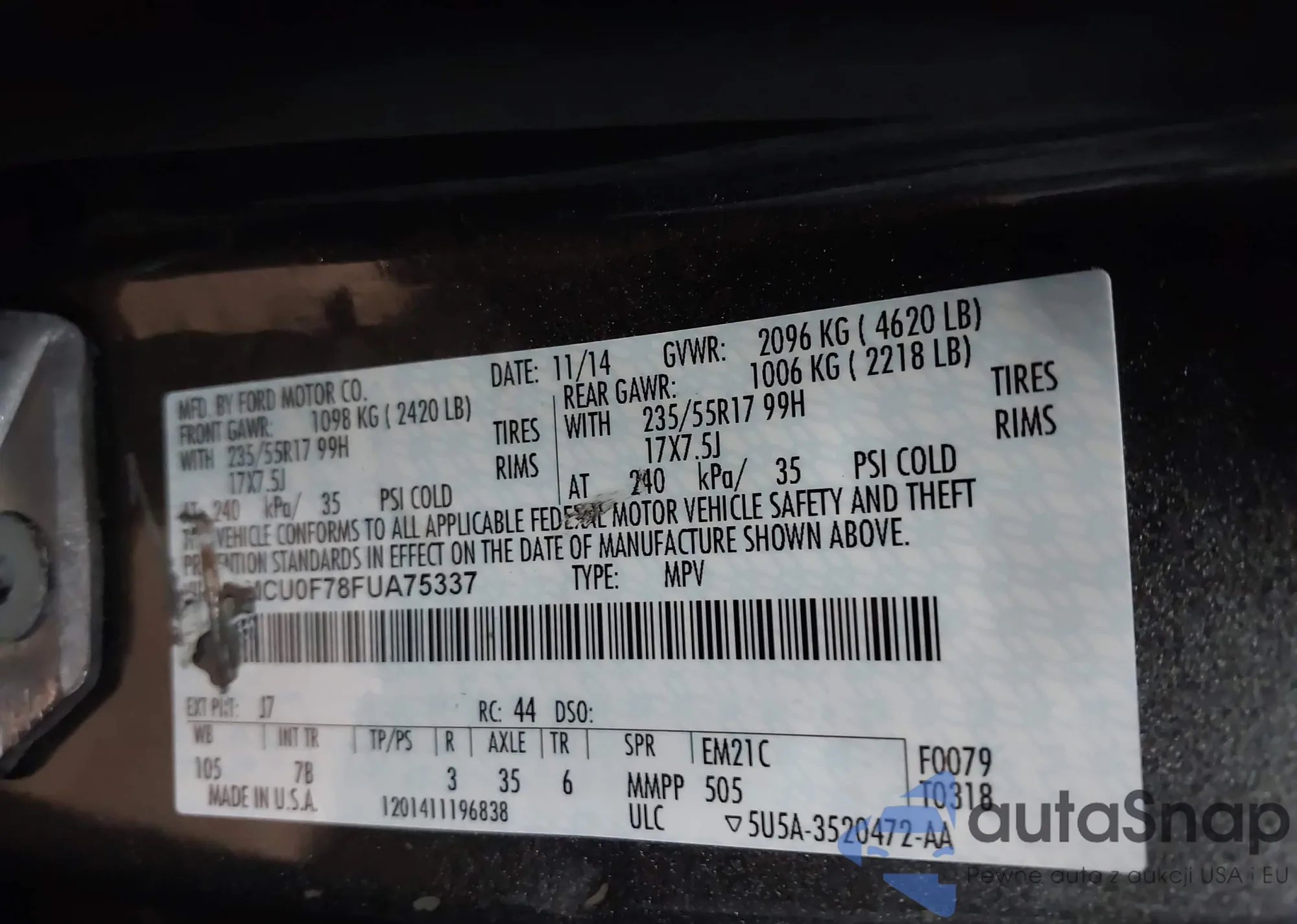 LOT: 43151095 VIN: 1FMCU0F78FUA75337