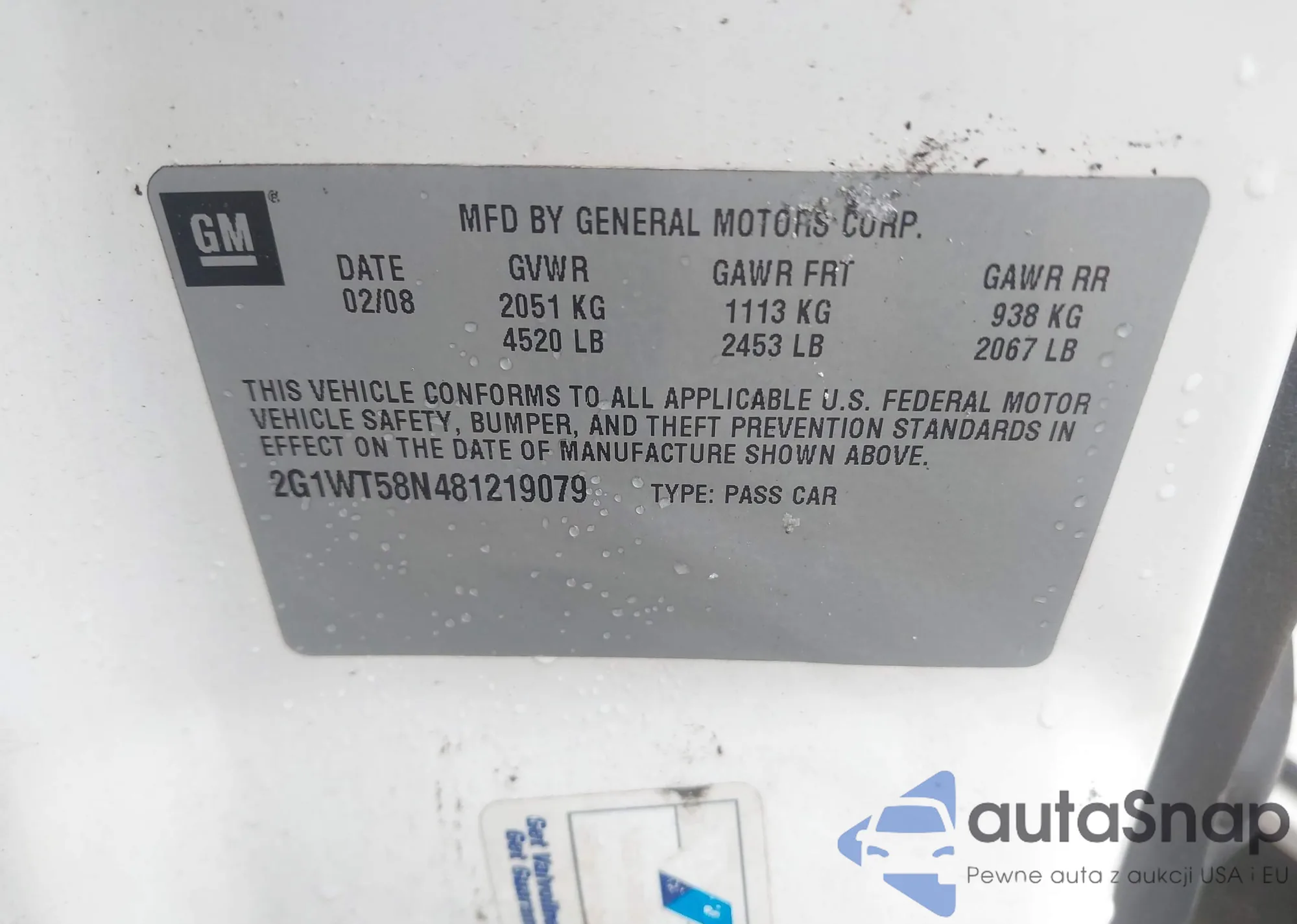 LOT: 41501744 VIN: 2G1WT58N481219079