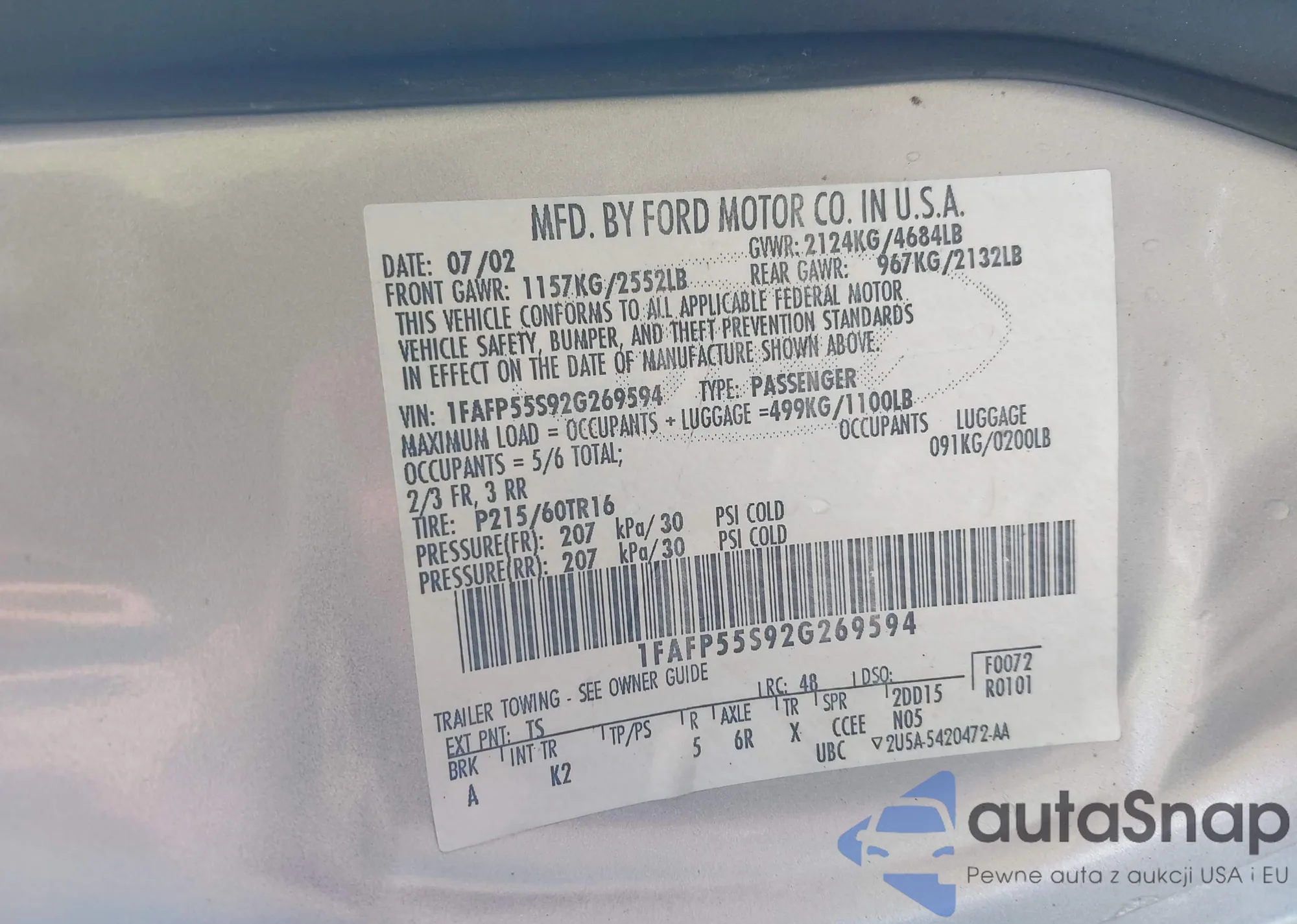 LOT: 42614522 VIN: 1FAFP55S92G269594