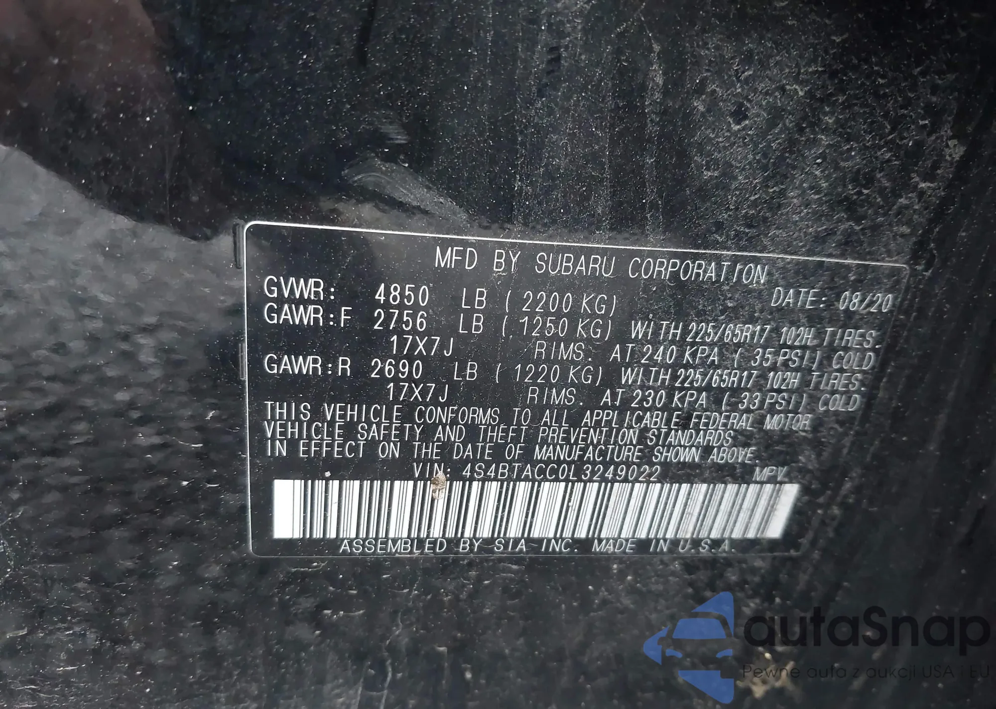LOT: 42948203 VIN: 4S4BTACC0L3249022