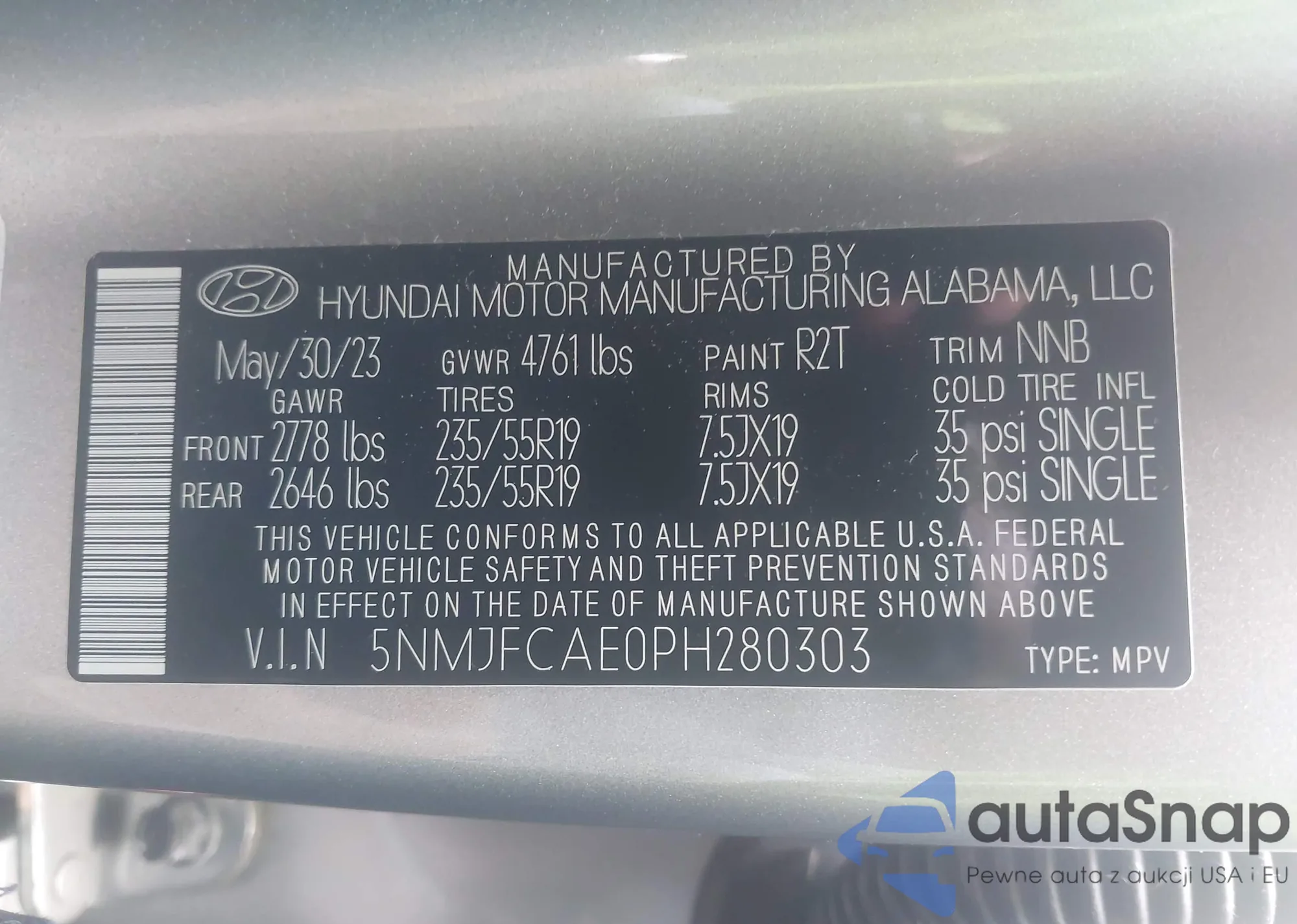 LOT: 43106968 VIN: 5NMJFCAE0PH280303