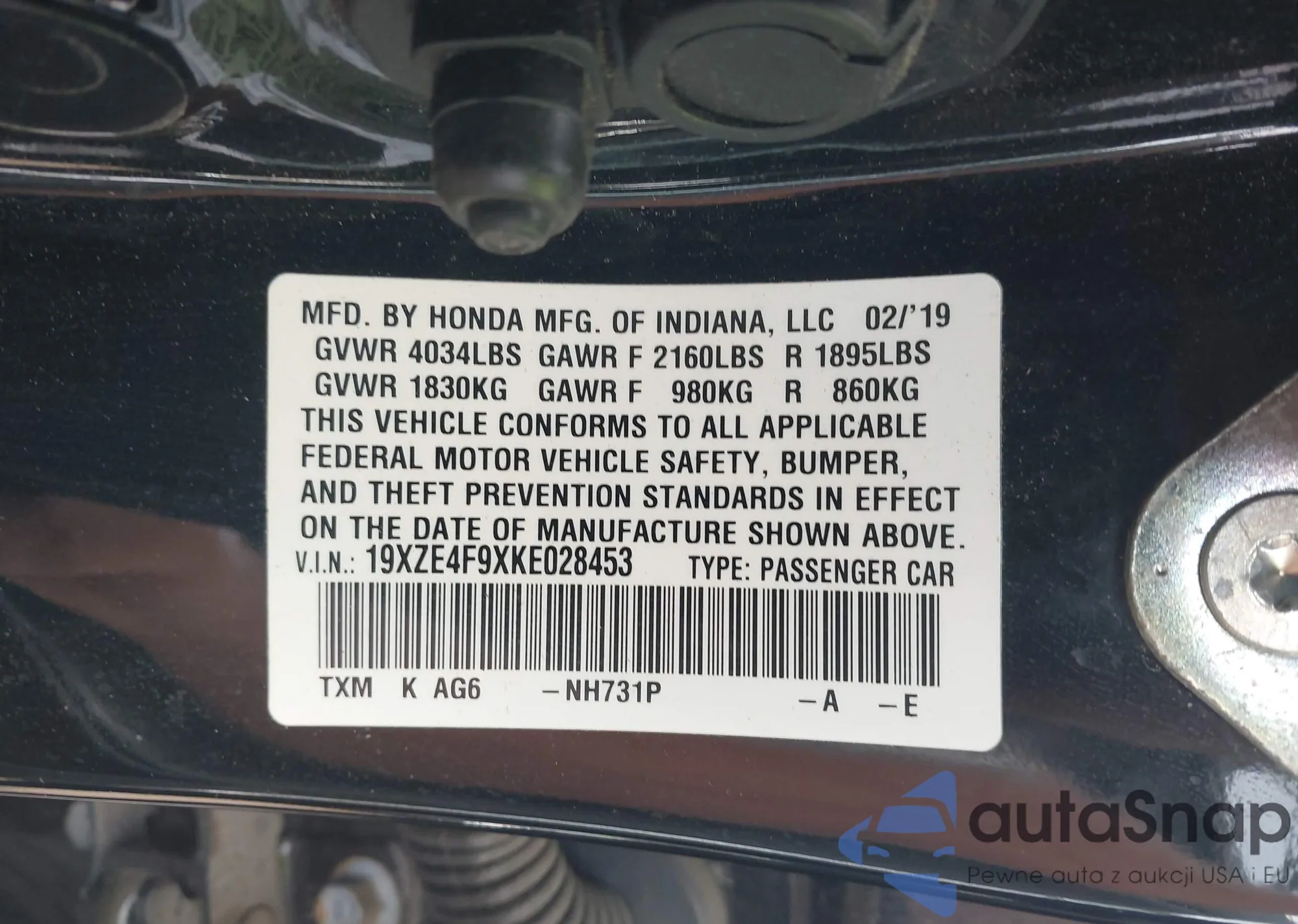 LOT: 43112447 VIN: 19XZE4F9XKE028453