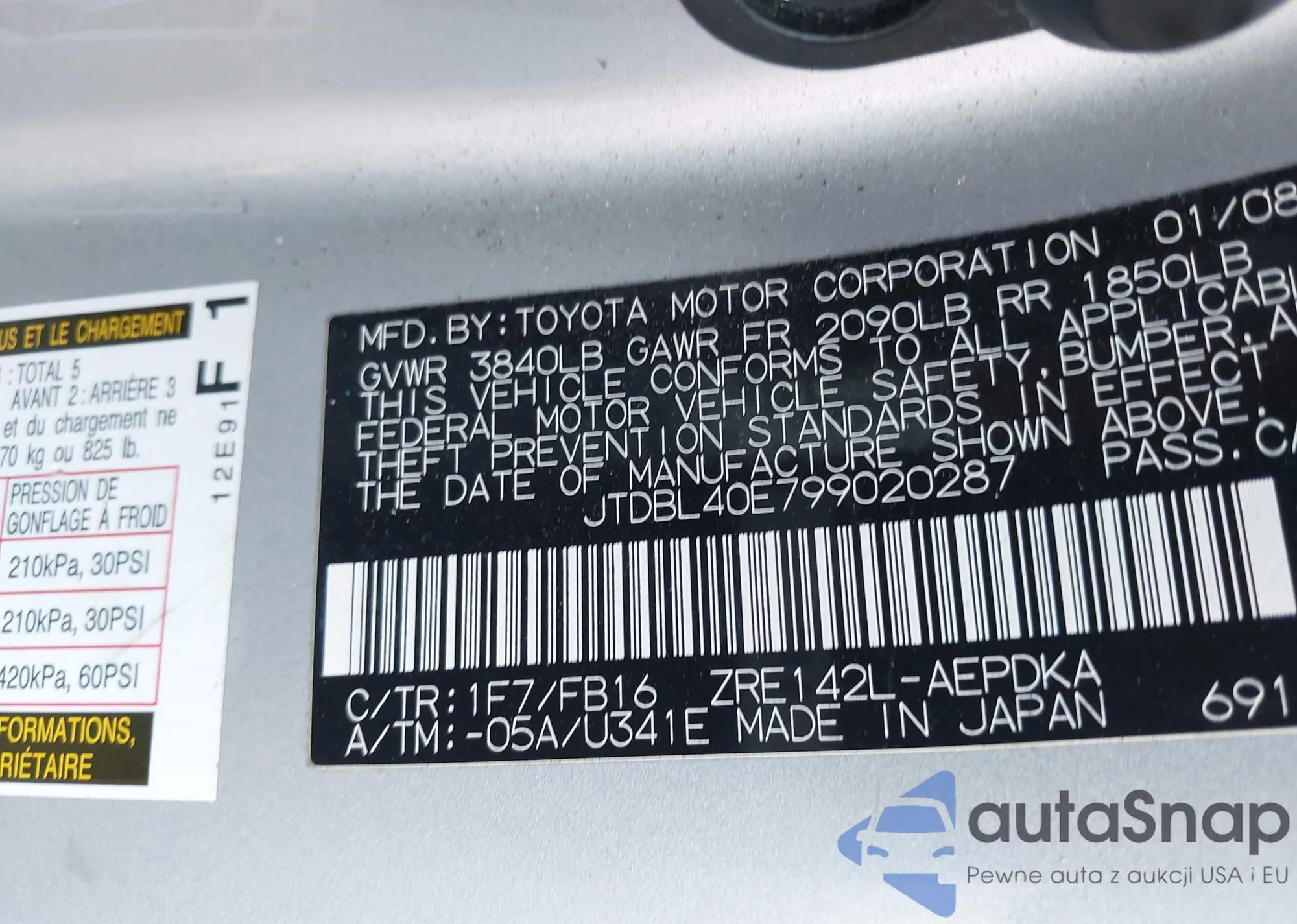 LOT: 43162506 VIN: JTDKN3DU7A0093240