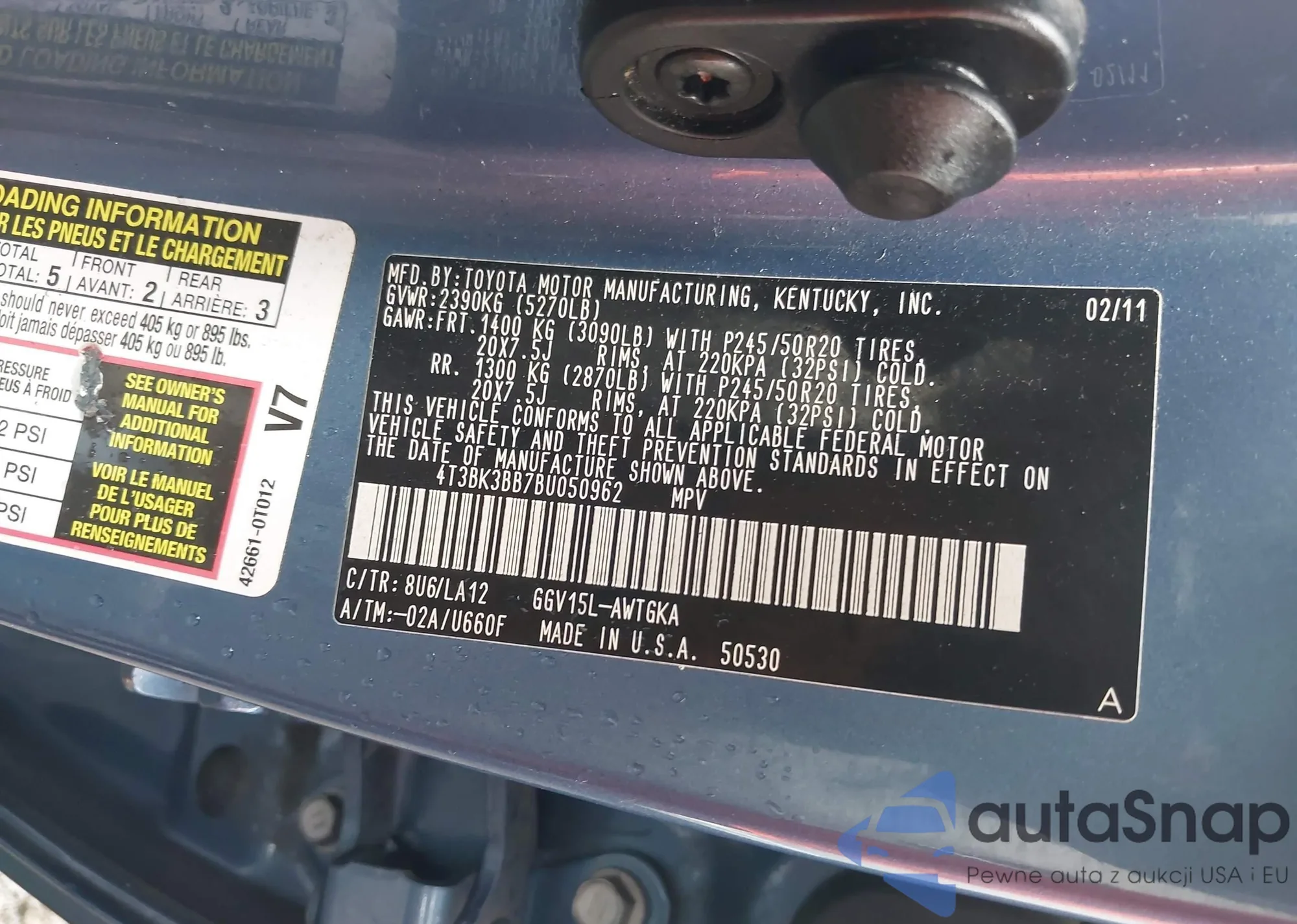 • VIN 4T3BK3BB7BU050962