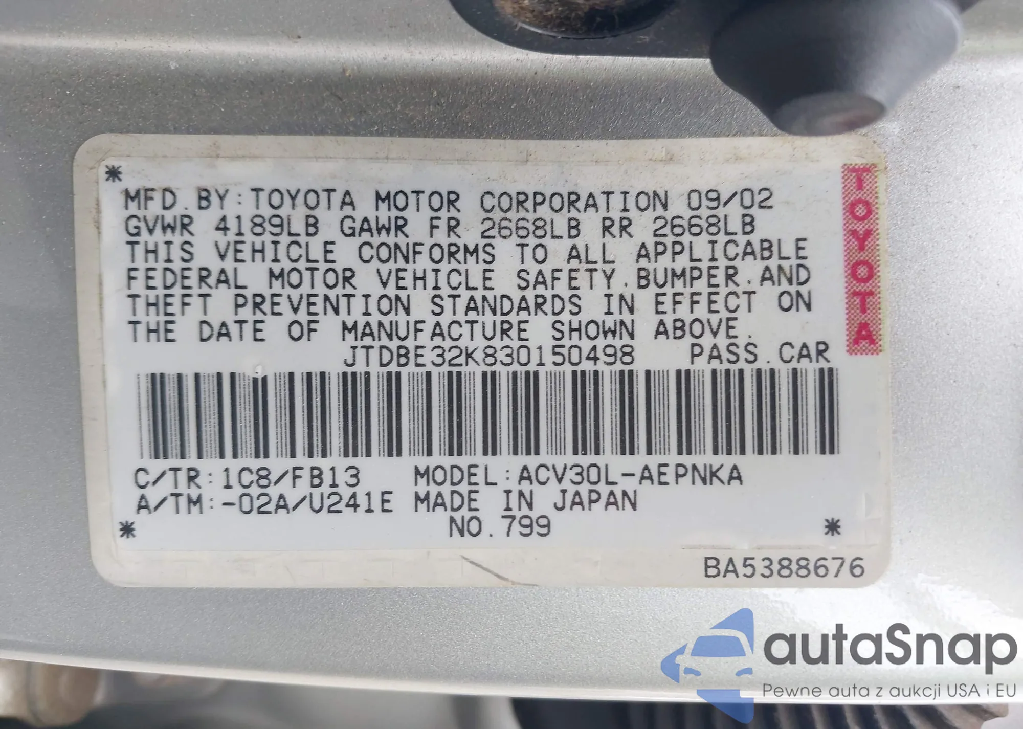 LOT: 42927010 VIN: JTEHF21A520049567