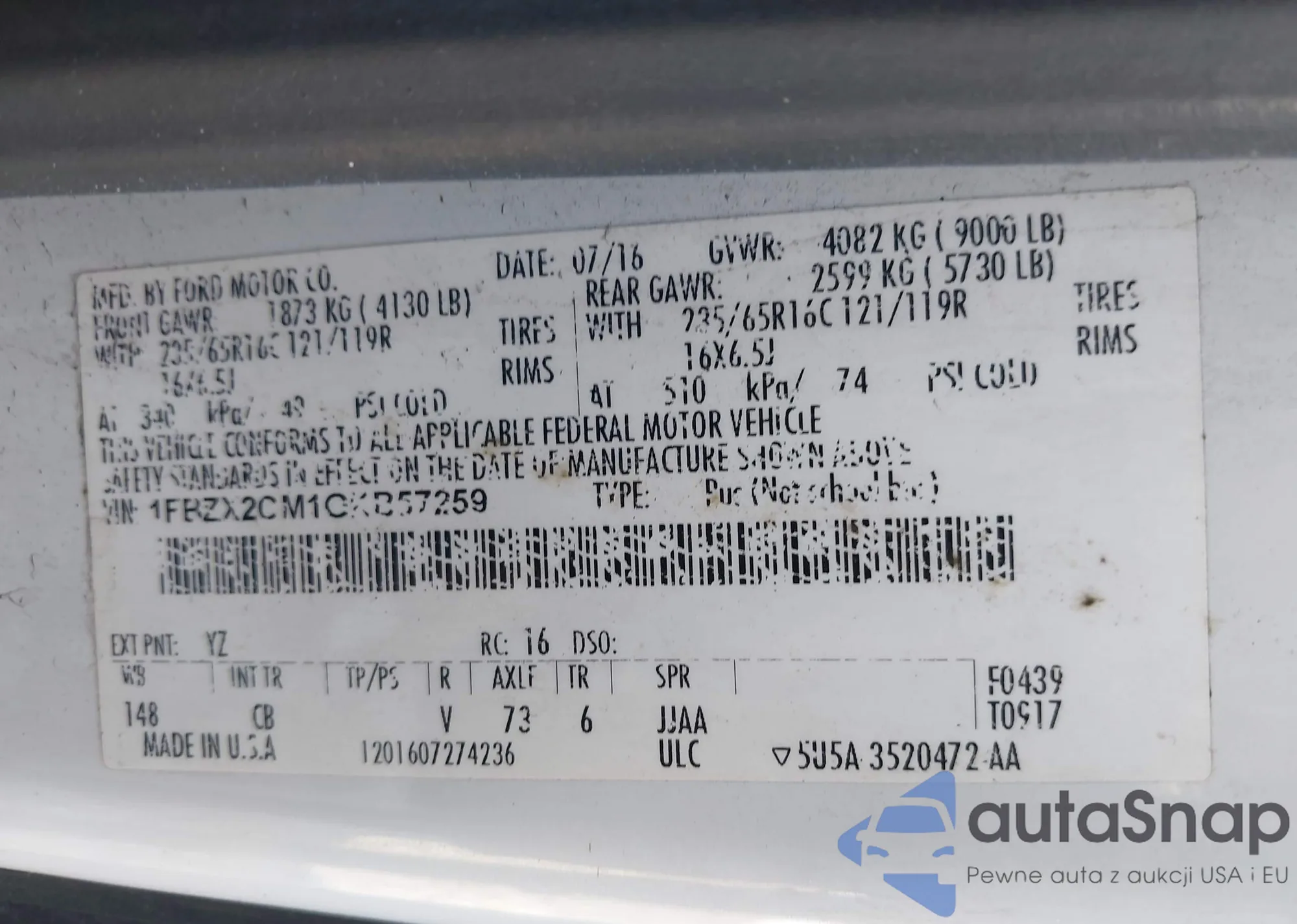 LOT: 42618676 VIN: 1FBZX2CM1GKB57259