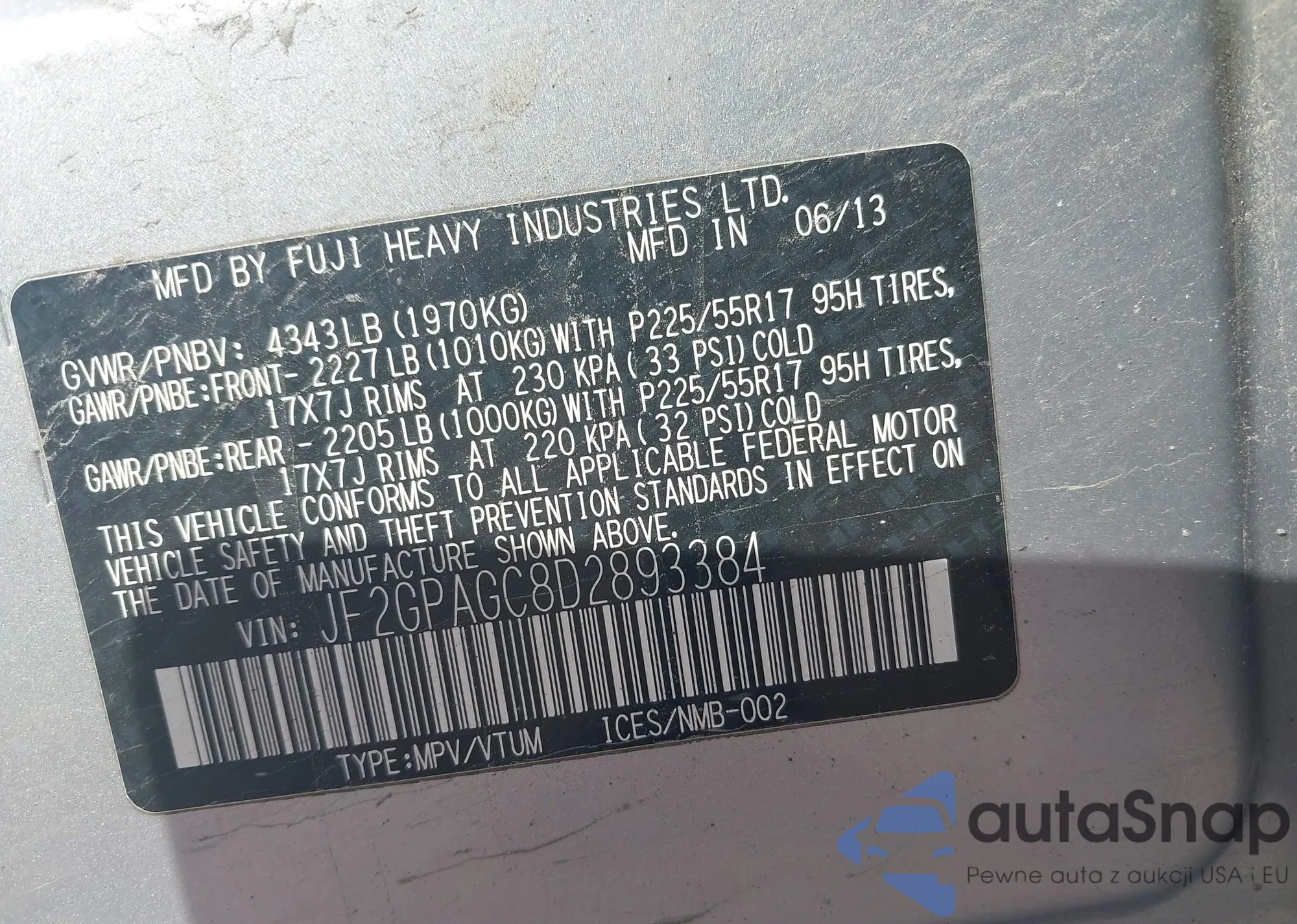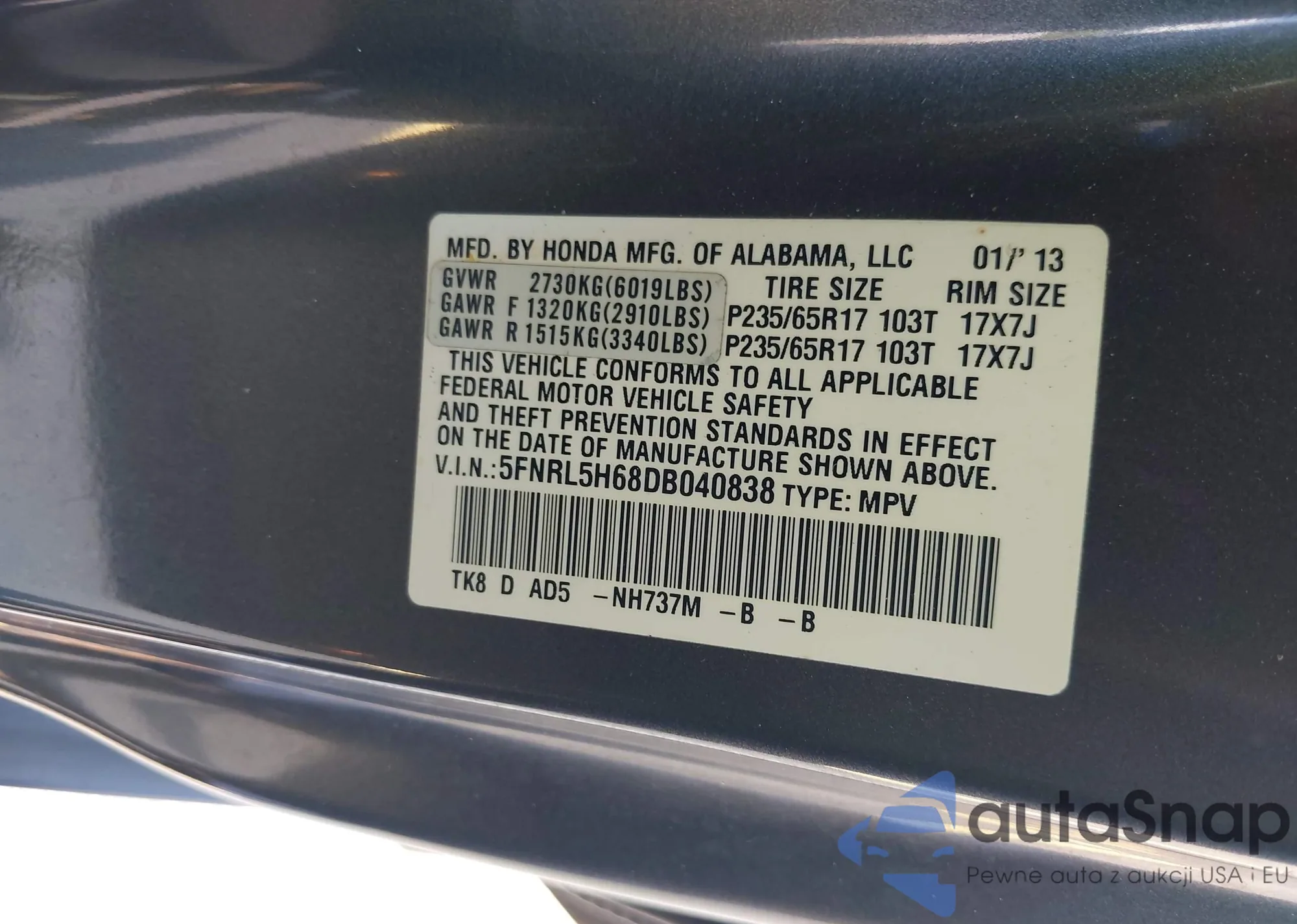 • VIN 5FNRL5H68DB040838