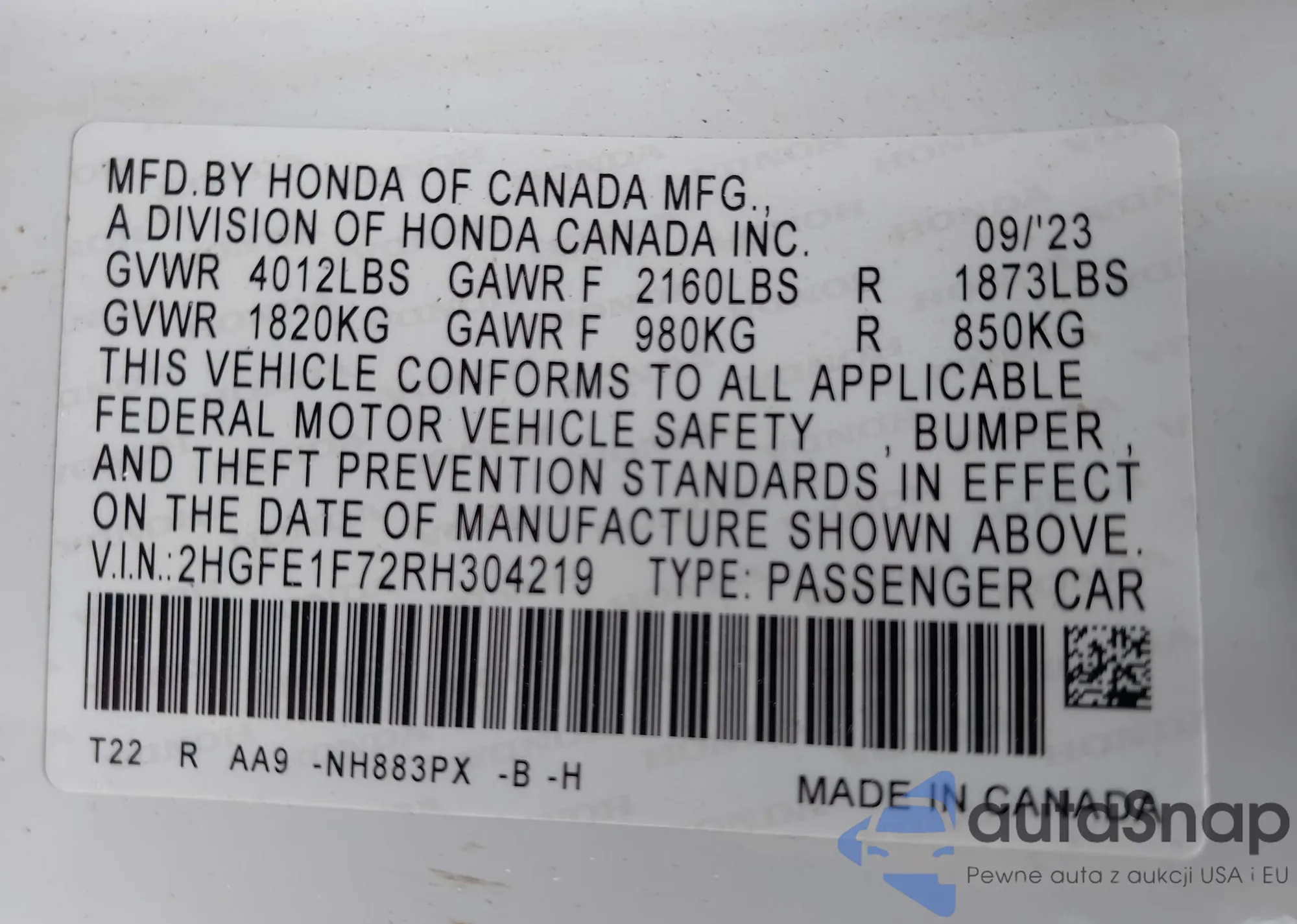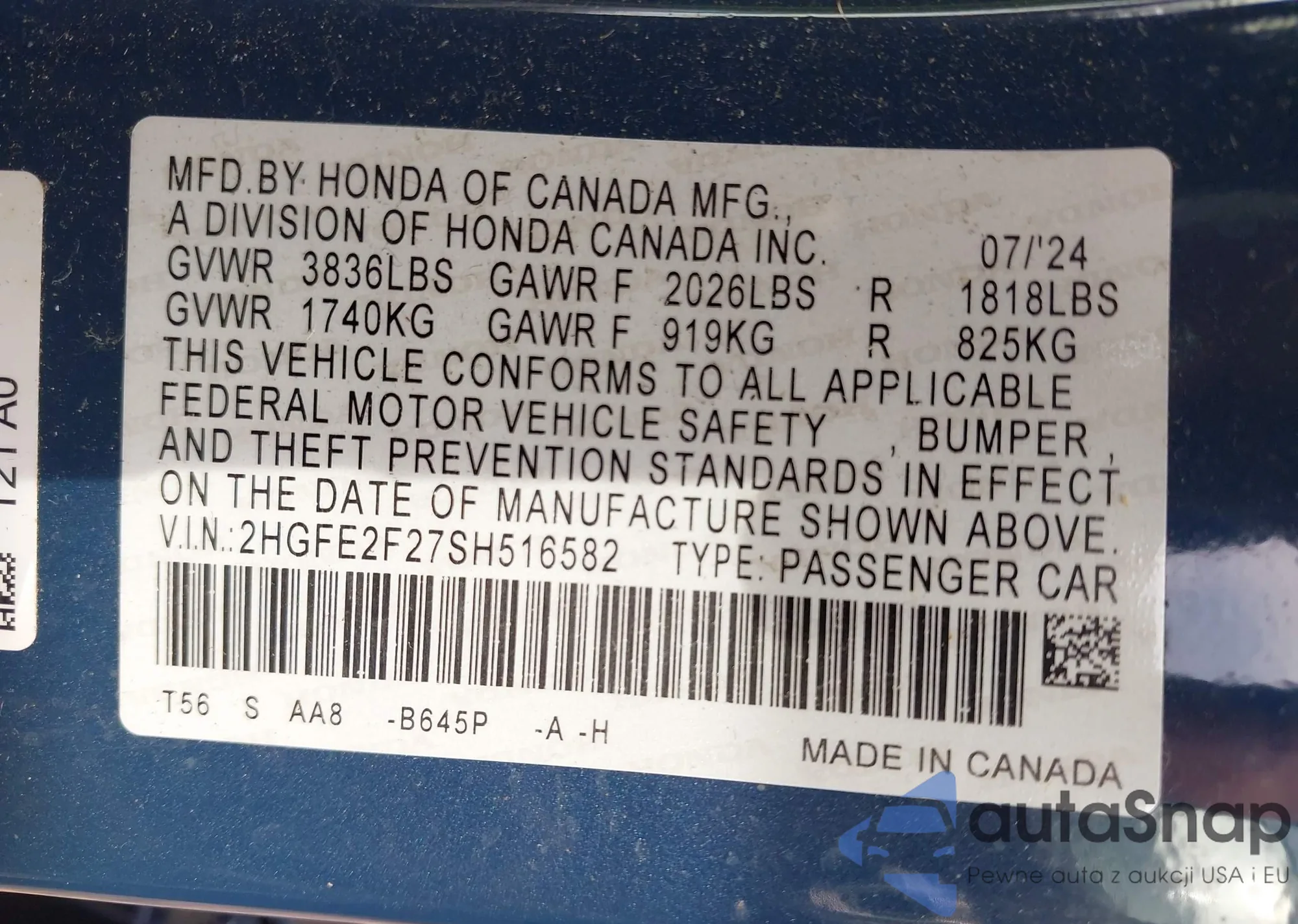 LOT: 42774587 VIN: 2HGFE2F27SH516582