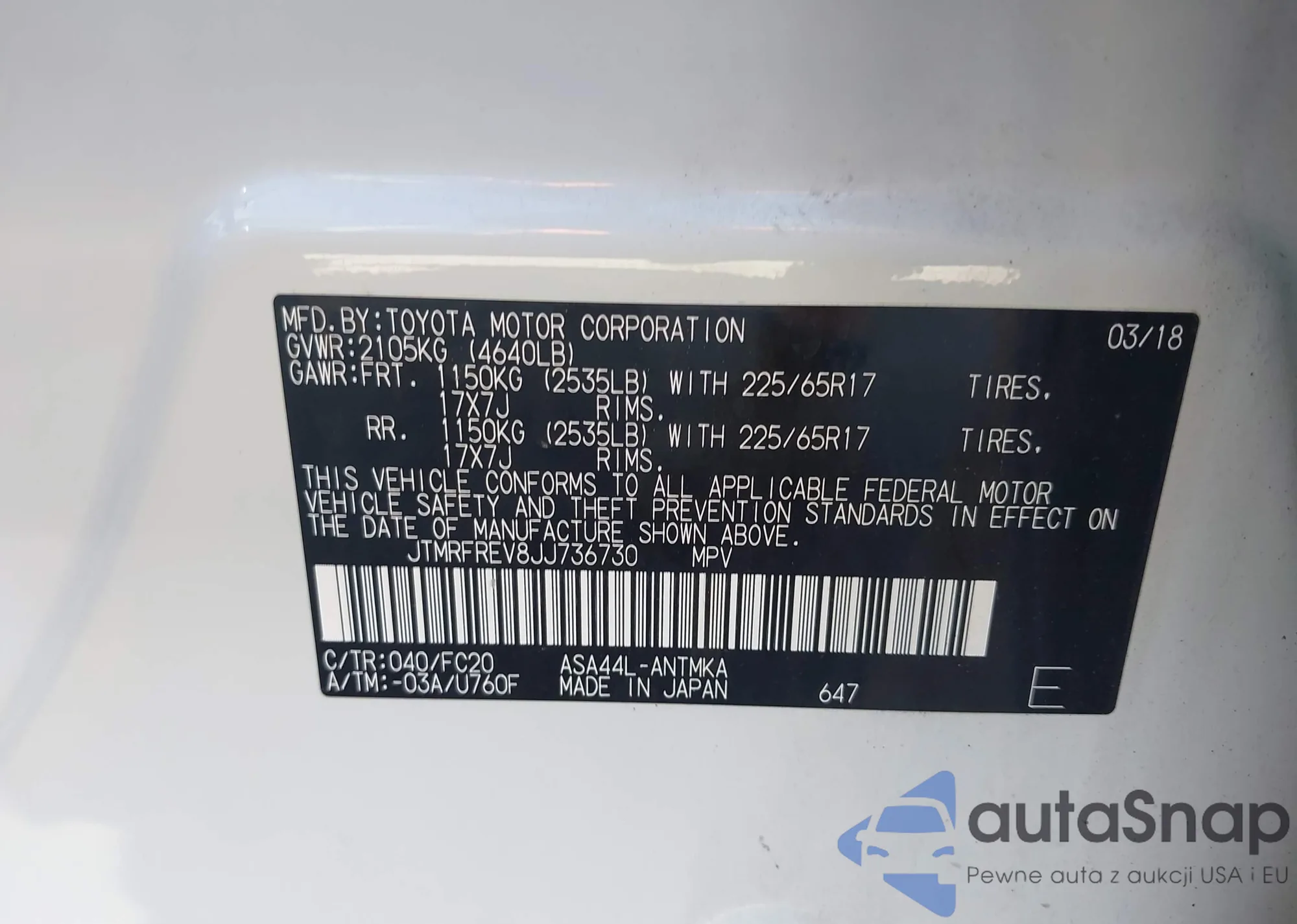 LOT: 42742545 VIN: JTMRFREV8JJ736730