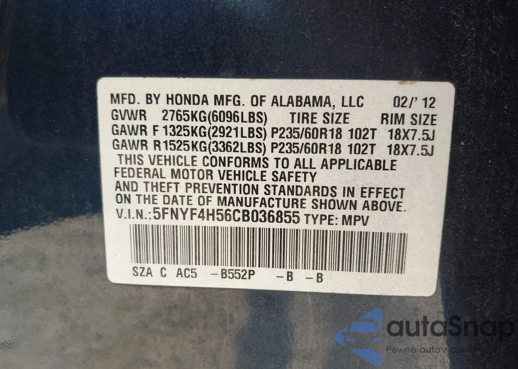 LOT: 42920891 VIN: 5FNYF4H56CB036855