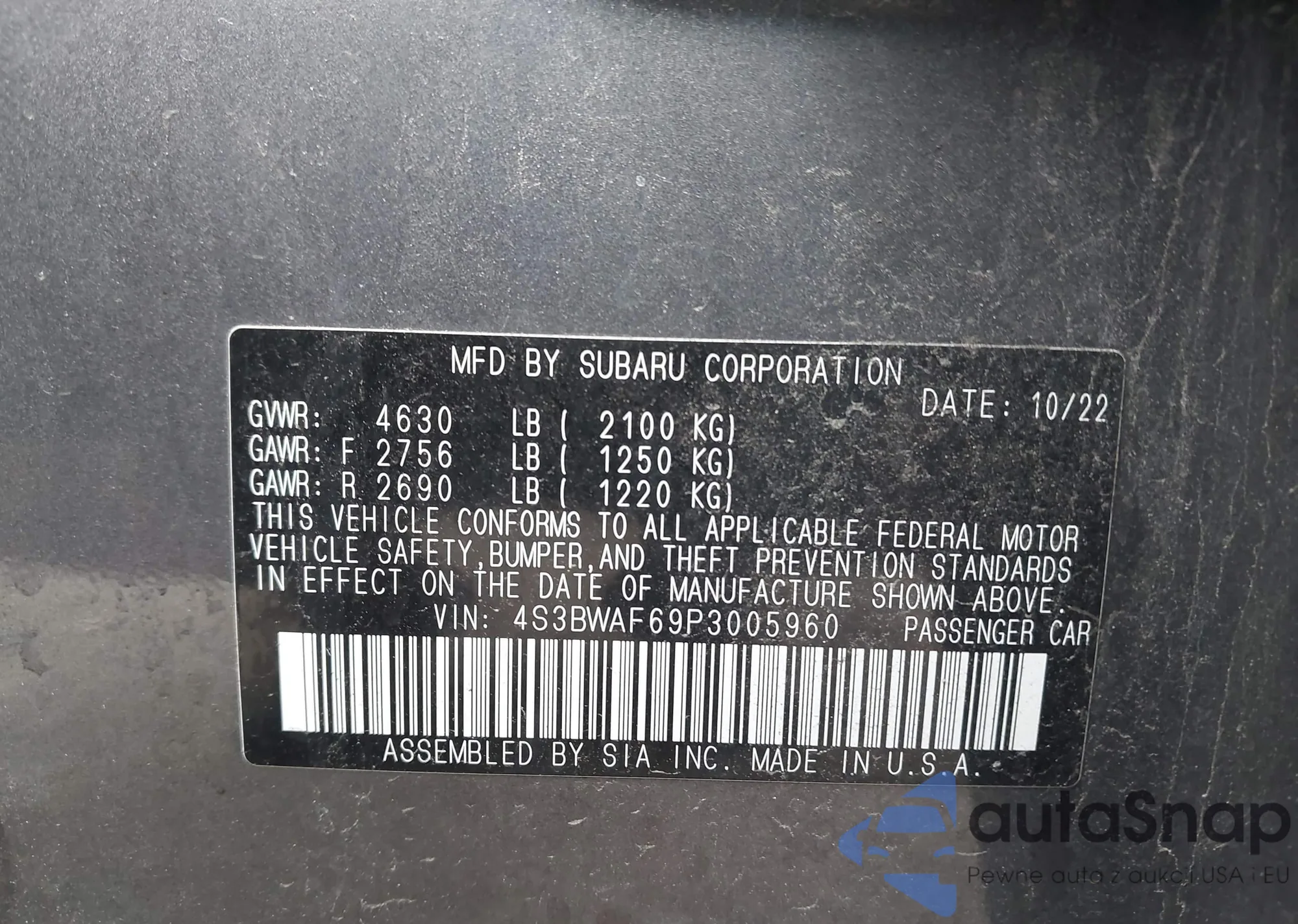 • VIN 4S3BWAF69P3005960