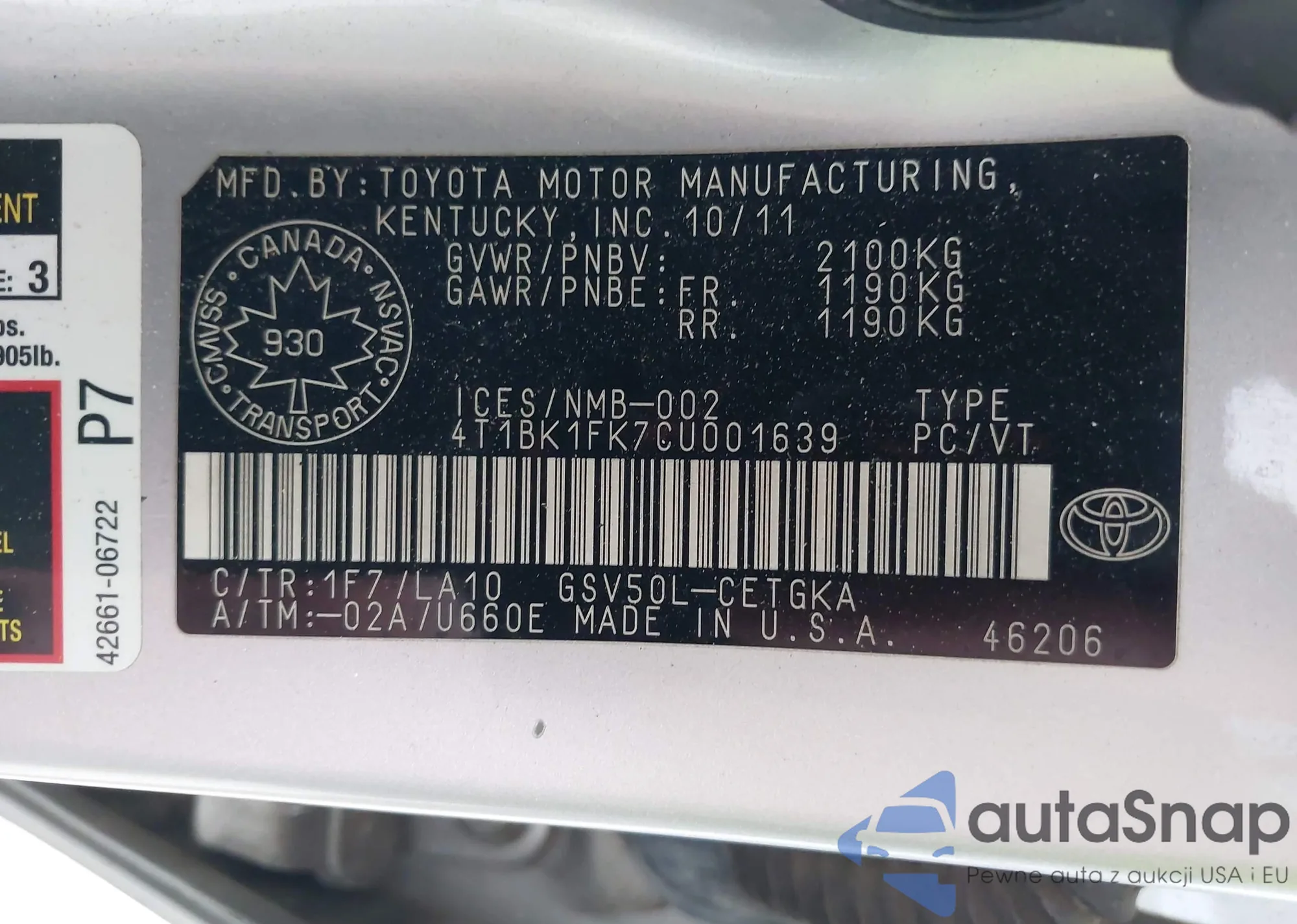 LOT: 42856867 VIN: 4T1BK1FK7CU001639