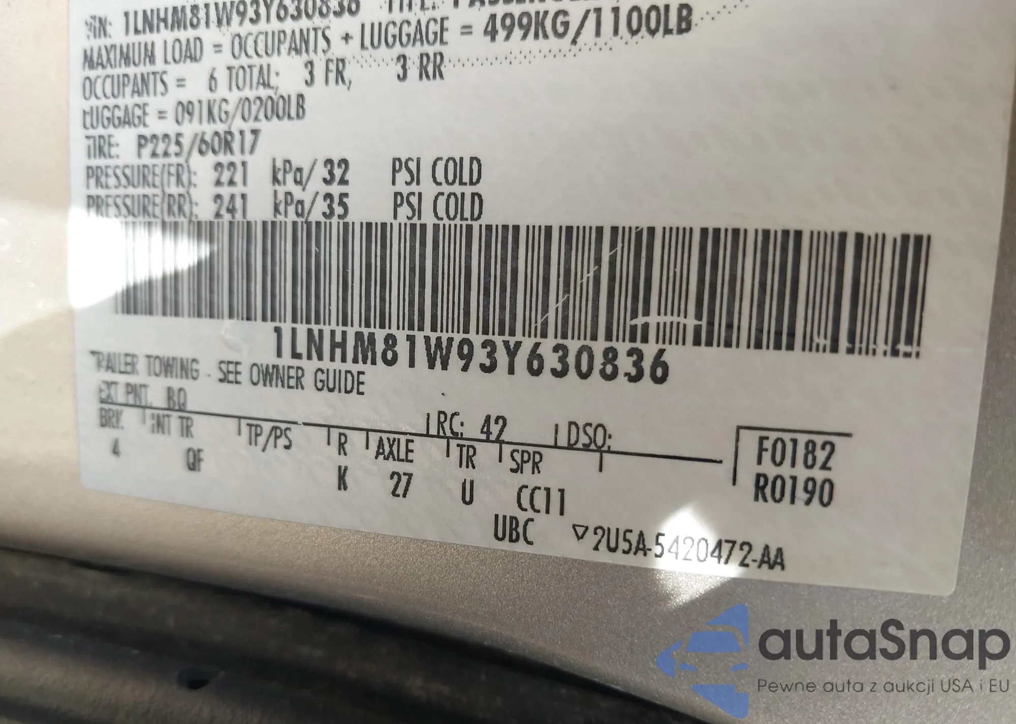 LOT: 42227072 VIN: 1LNHM81W93Y630836