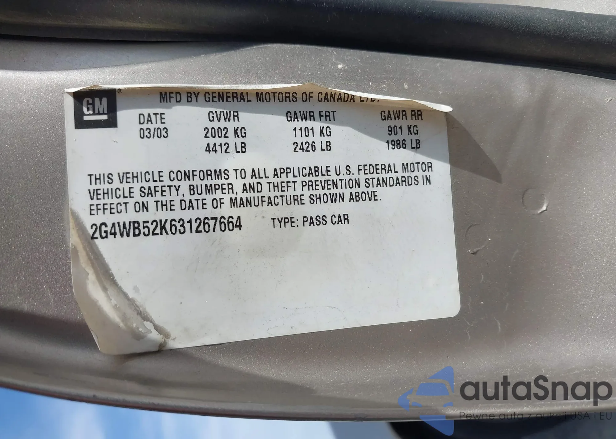 LOT: 43248182 VIN: 2G4WB52K631267664