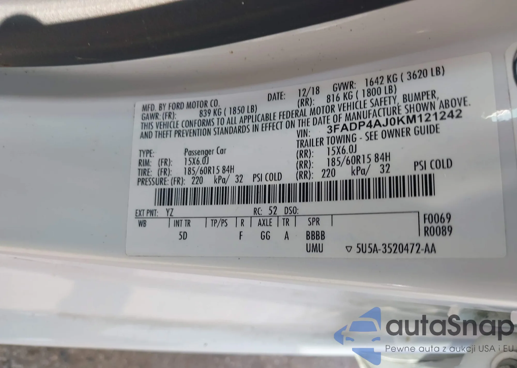 LOT: 43087711 VIN: 3FADP4AJ0KM121242