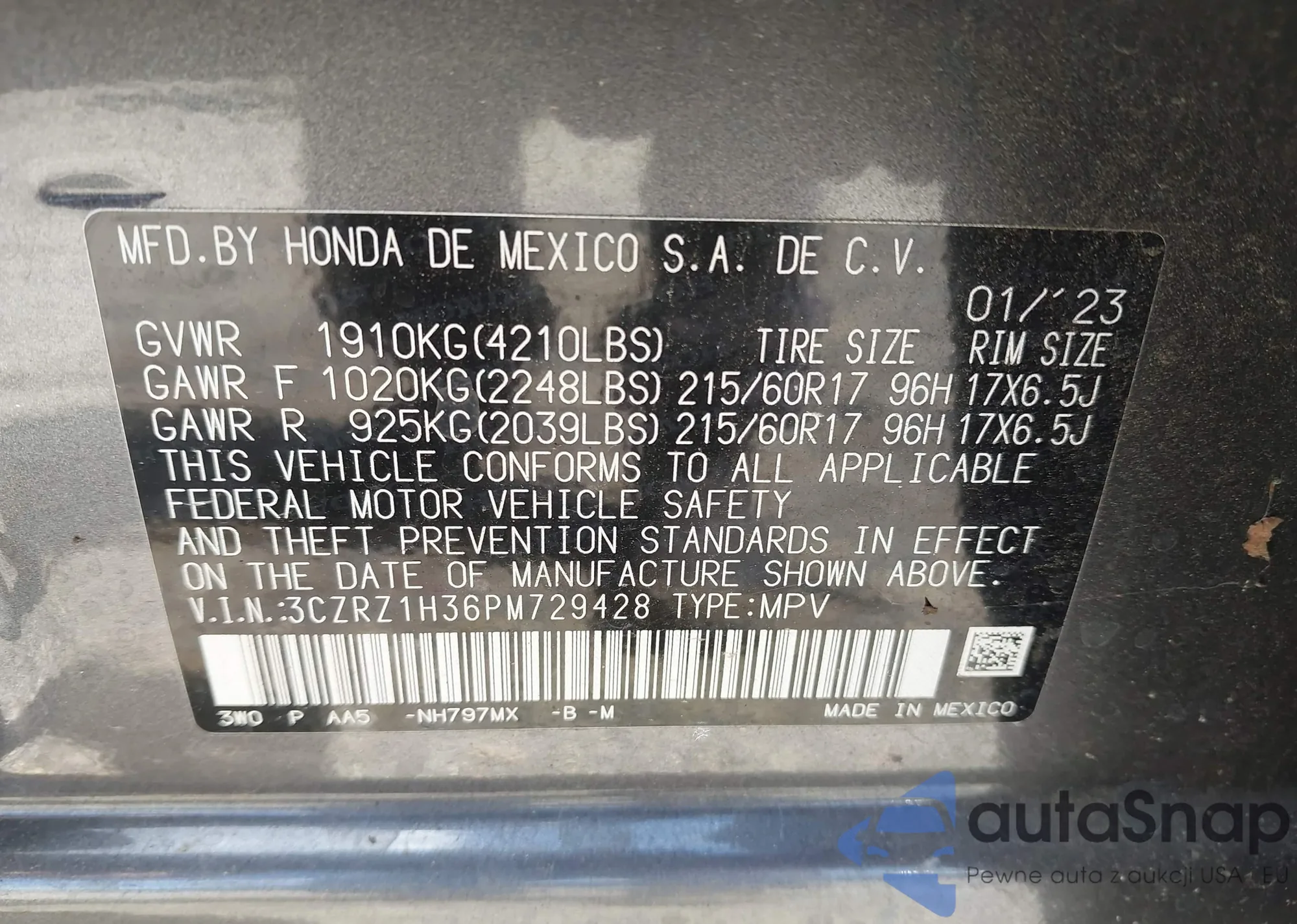 LOT: 42969228 VIN: 3CZRZ1H36PM729428