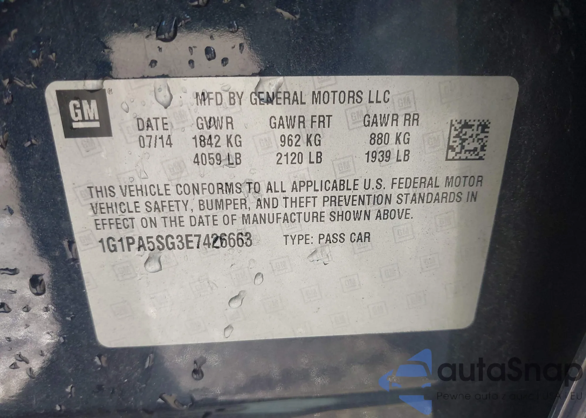 LOT: 43071671 VIN: 1G1PA5SG3E7426663