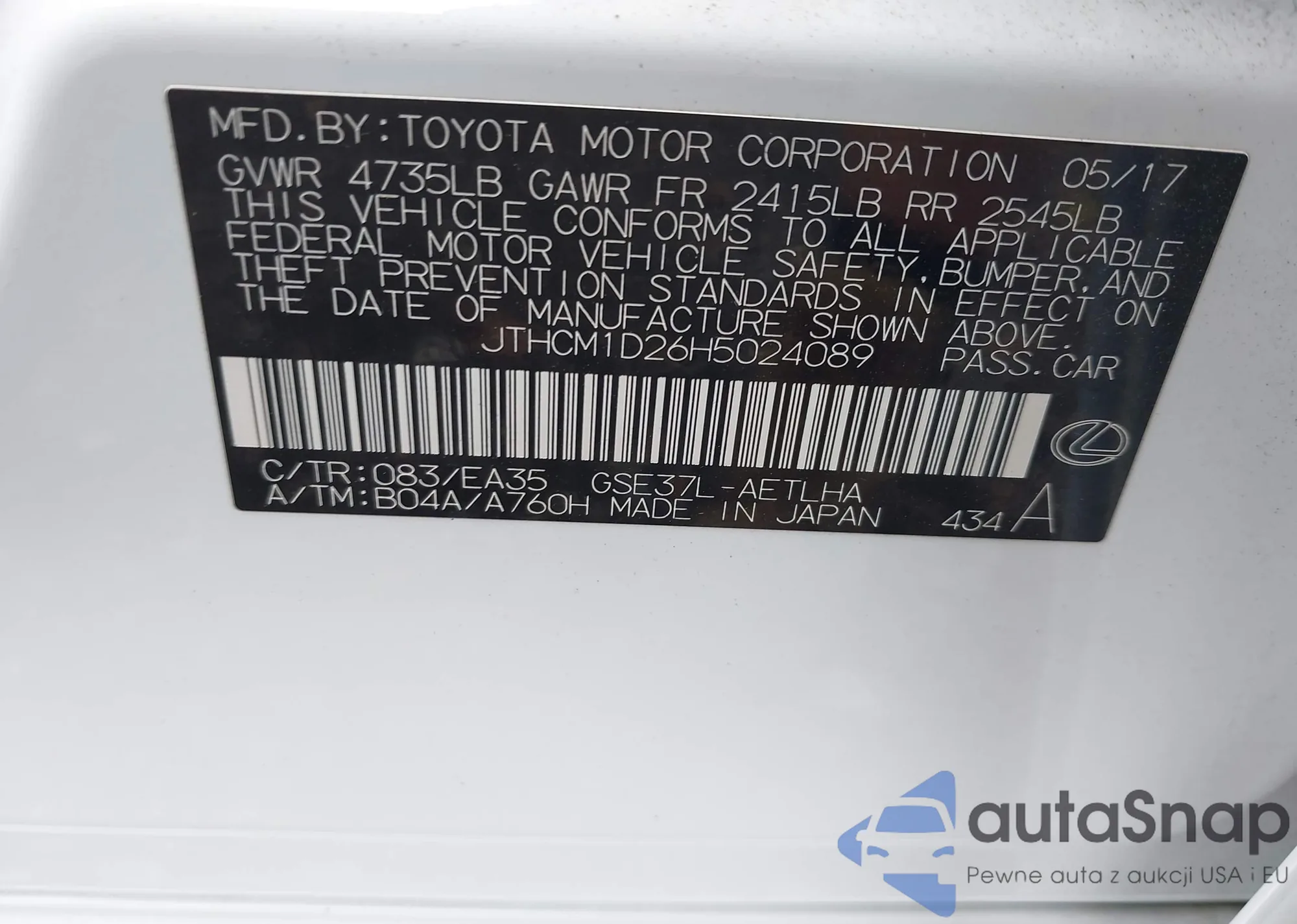 LOT: 43227628 VIN: JTHCM1D26H5024089