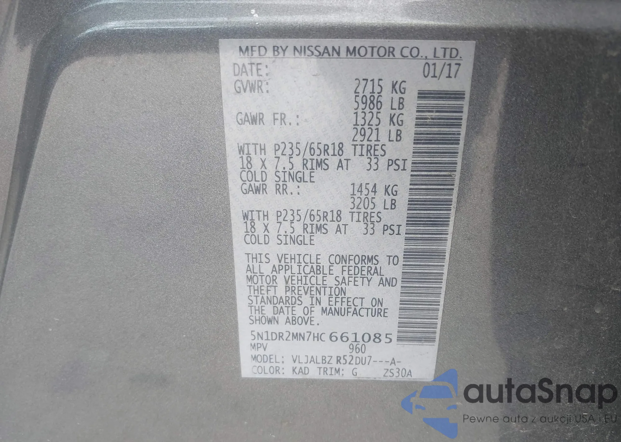 LOT: 42764051 VIN: 5N1DR2MN7HC661085